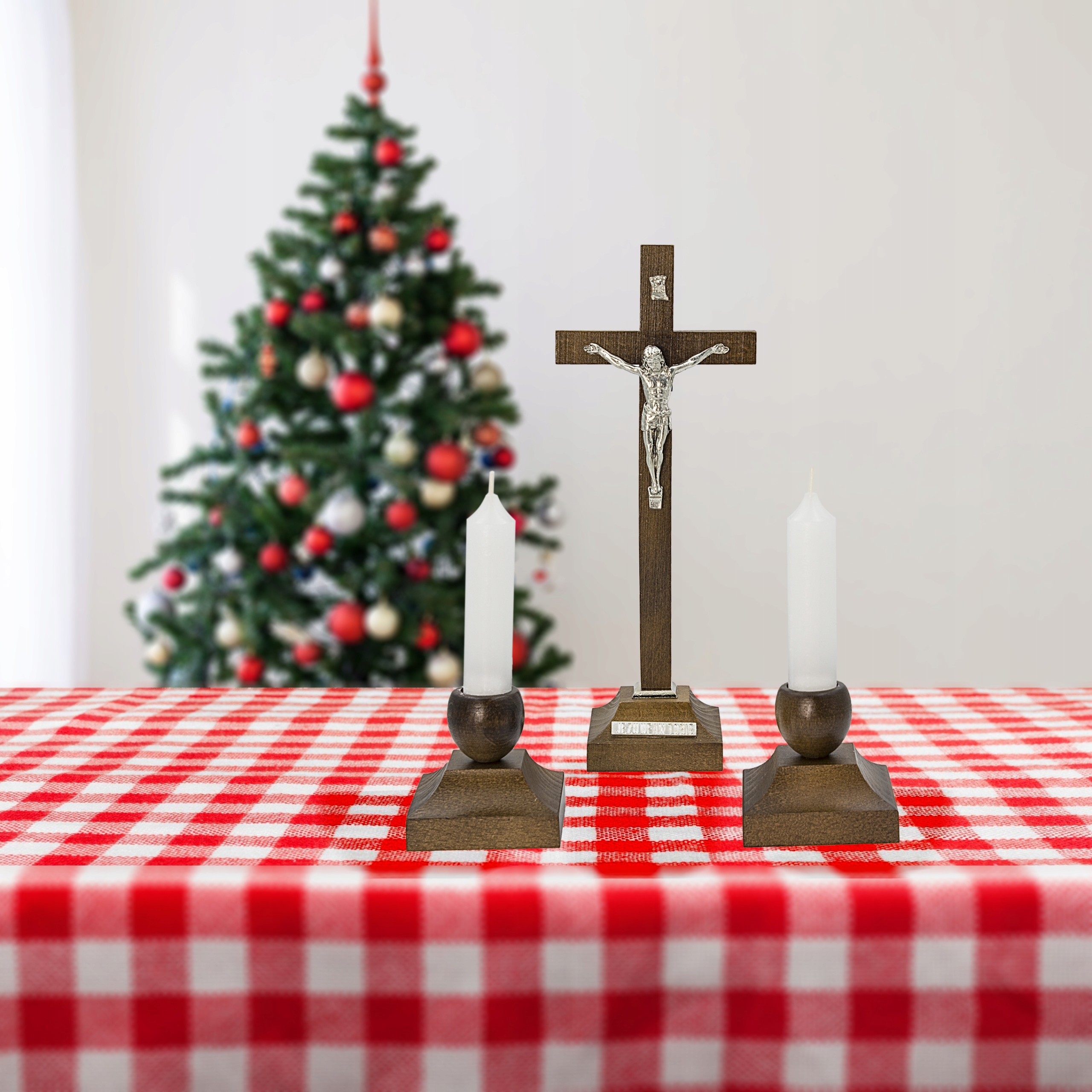 Ми пропонуємо елегантний релігійний набір, який поєднує в собі високу якість та естетику. Набір включає хрест із фігурою Ісуса Христа та двох свічок на дерев’яних трибунах. Набір ідеально підходить для домашнього вівтаря, а також унікального подарунка для різних релігійних випадків, таких як хрещення, причастя чи підтвердження. Розміри: