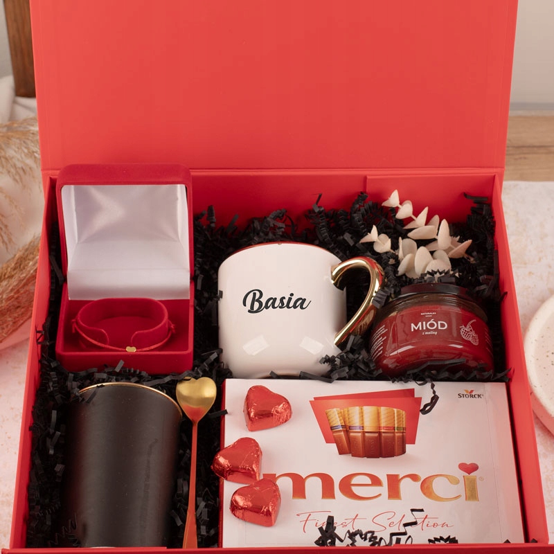 У красивій коробці ви знайдете кухоль із ім’ям і золотою ручкою, ароматний чай, натуральний мед і золоту ложку у формі серця – ідеальний набір для післяобіднього відпочинку. Все це доповнюється шоколадними цукерками Merci та цукерками у формі серця, які додають трохи задоволення. Тонким акцентом є червоний браслет із серцем, який поміщено в елегантну коробку.