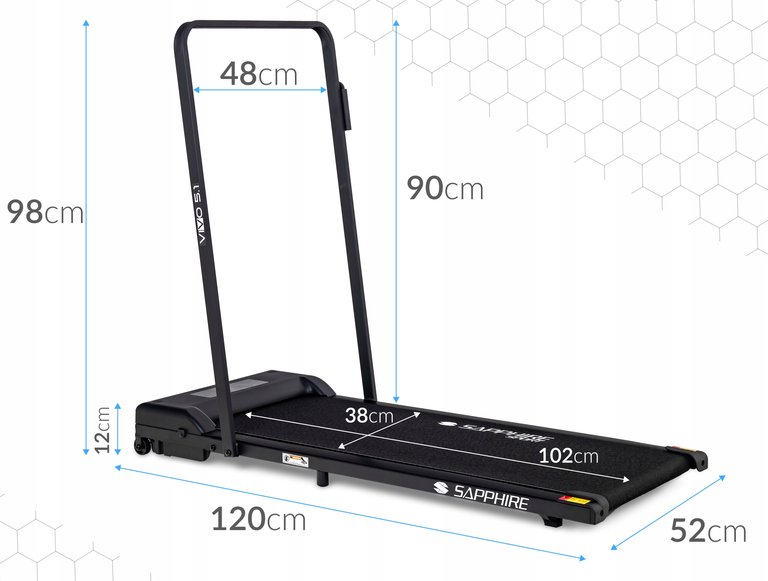 - У моделі Sapphire VIVO, завдяки оптимальній конструкції конструкції, ширина бігового полотна становить цілих 38 см. Це дуже хороший результат, враховуючи компактні розміри пристрою.