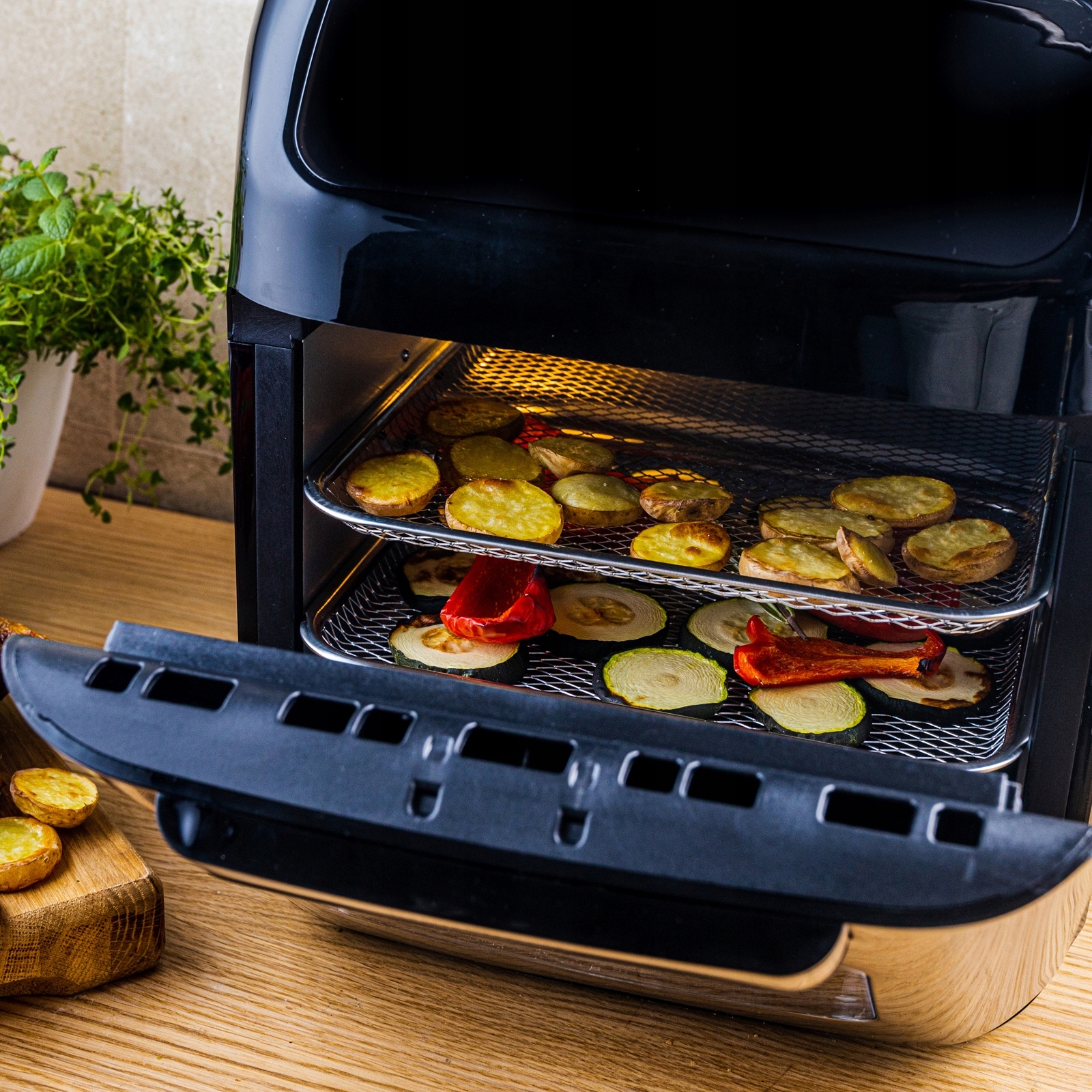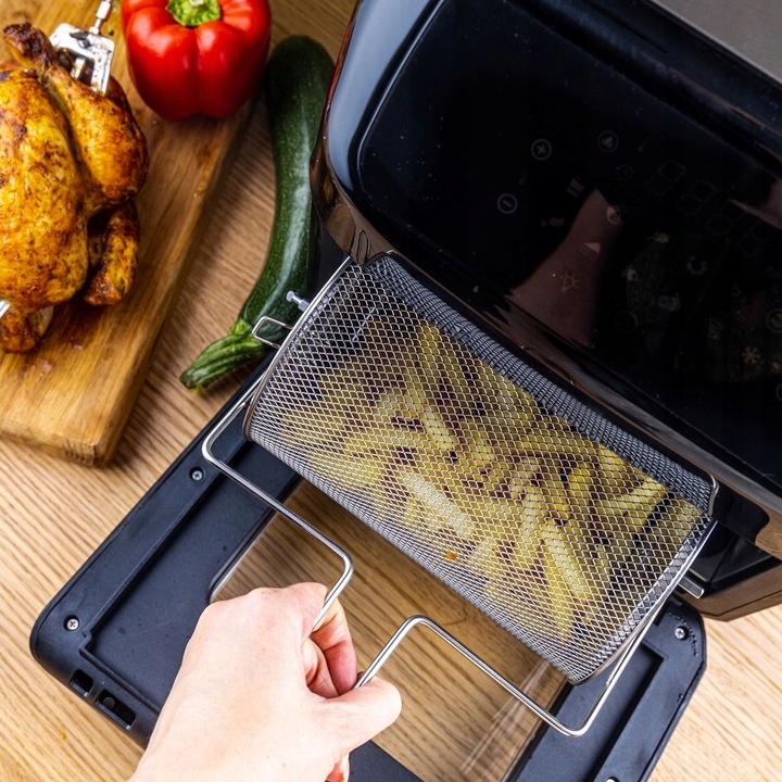 Універсальна електрична духовка дозволяє готувати м'ясо, рибу, овочі та випічку без додавання жиру. Оснащений функцією гриль з обертовим кошиком для курки та шампурів, а завдяки системі циркуляції гарячого повітря їжа пропікається рівномірно та швидше, без ризику пригорання.