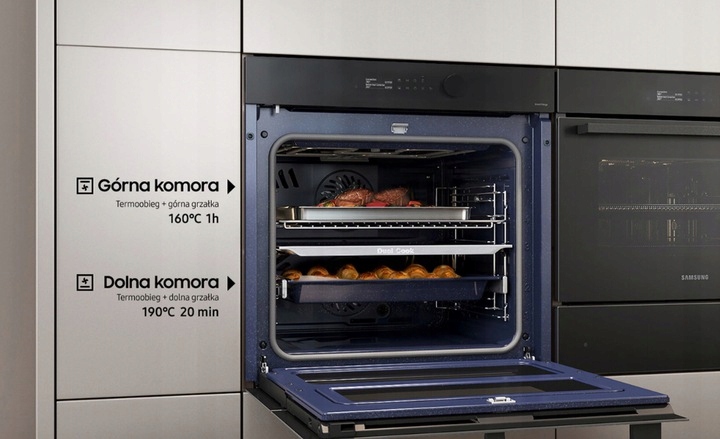 Більш гнучке та ефективне приготування різноманітних страв. Верхня та нижня зони Dual Cook Flex працюють незалежно одна від одної. Ви можете використовувати верхню для випікання менших страв, використовувати обидві зони одночасно для приготування різних страв, які вимагають різної температури та часу, або використовувати всю камеру духовки для випікання особливо великих страв, наприклад, індички. Крім того, дверцята, розділені навпіл, гарантують легкий доступ до верхньої зони, що дає можливість стежити за процесом випічки, не боячись порушити процес у нижній зоні духовки.
