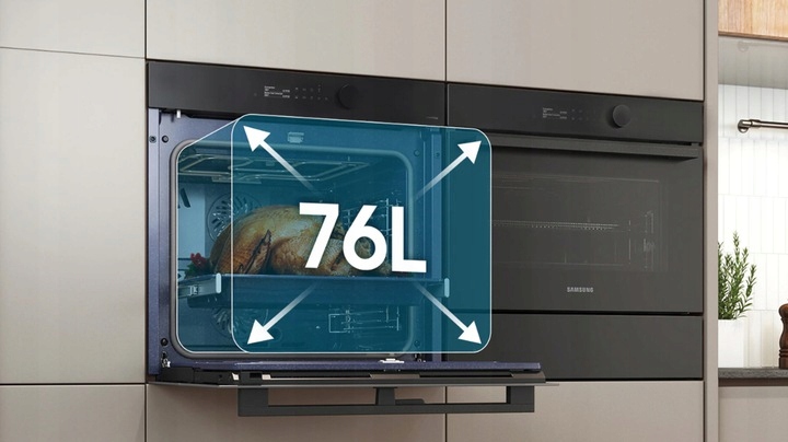 Ємність до 76 л полегшує приготування великих або більших страв. Це відкриває нові можливості при приготуванні їжі. Готуючи вечірку, ви можете легко приготувати різні страви одночасно. Духовка легко вміщає навіть великі страви, наприклад, велику індичку, заплановану на сімейну зустріч.
