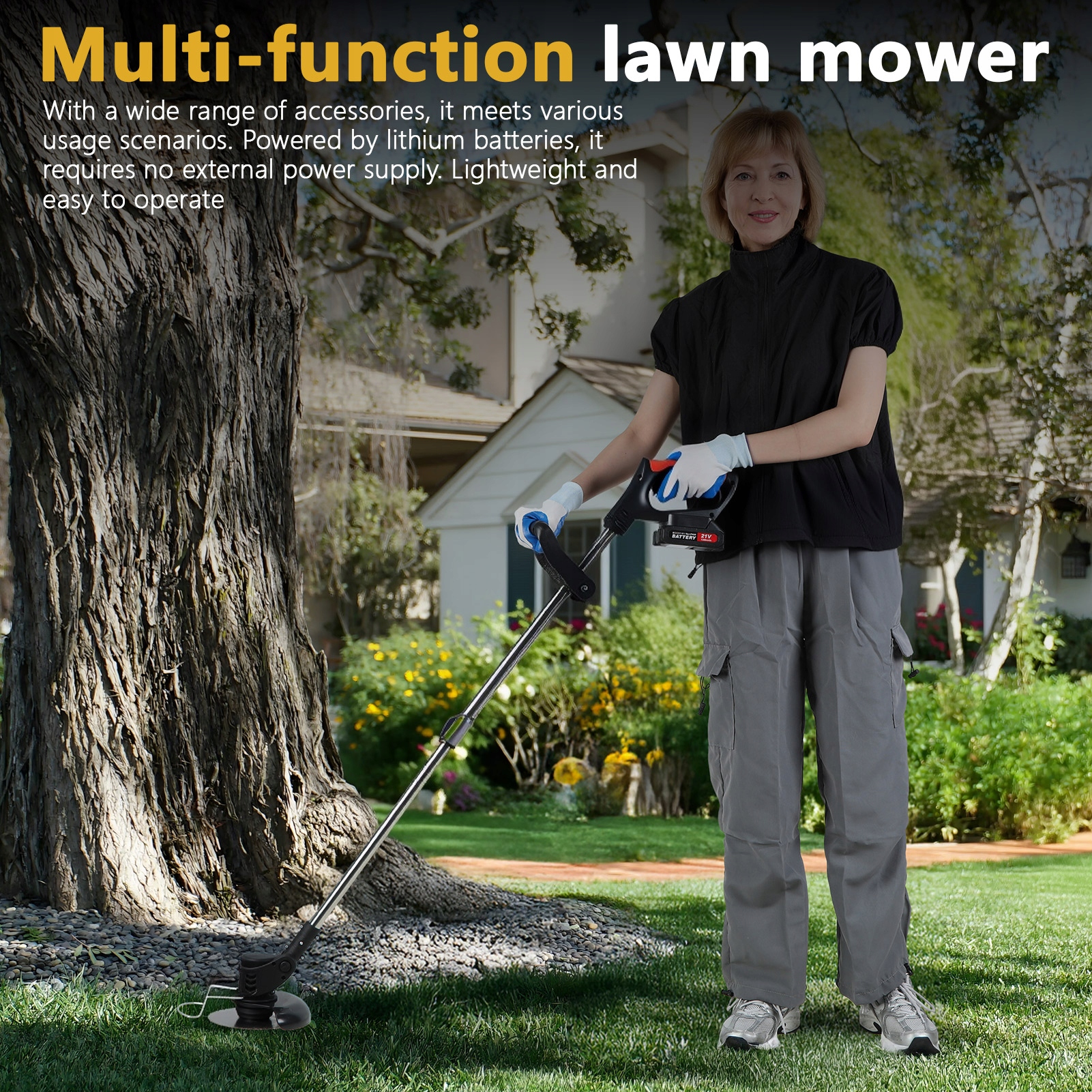 Високопродуктивна акумуляторна газонокосарка, оснащена двигуном високої потужності 650 Вт і 2 літієвими акумуляторами високої ємності 21 В 2000 мАг, що забезпечує швидкість 18 000 обертів за хвилину для підстригання трави, упорядкування клумб і видалення бур'янів, зручно для робіт з догляду на вулиці.