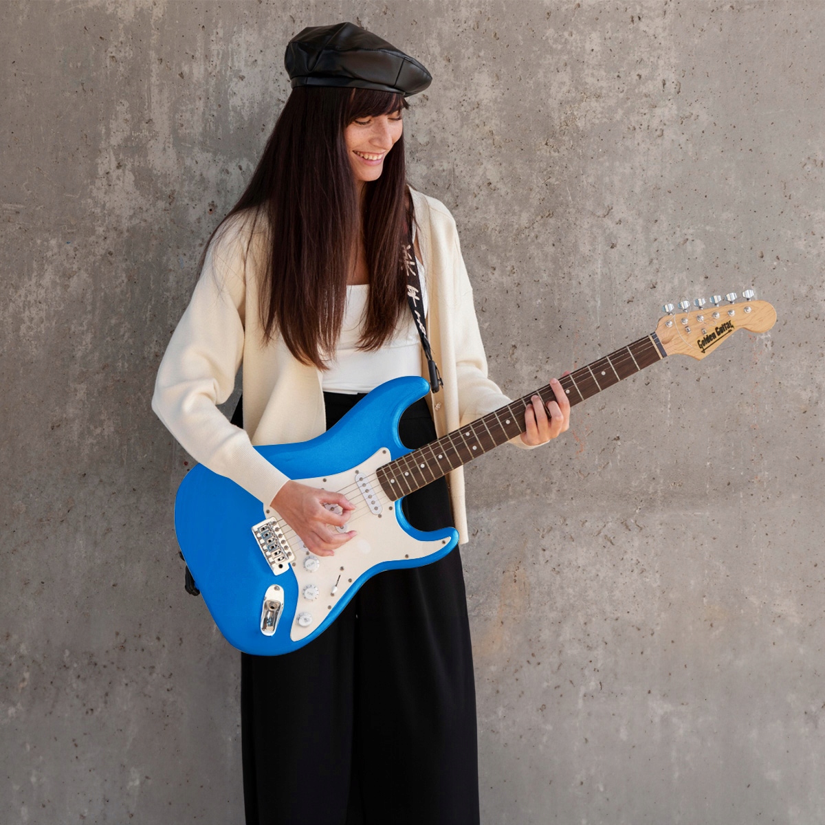 Електрична гітара з класичною формою Stratocaster, відрізняється високою якістю, універсальним звуком та оригінальною синьою високою блиском. Цей повний гітарний набір створений для людей, які починають свою пригоду з музикою, а також більш досконалими гравцями, які шукають міцний інструмент для повсякденних вправ.