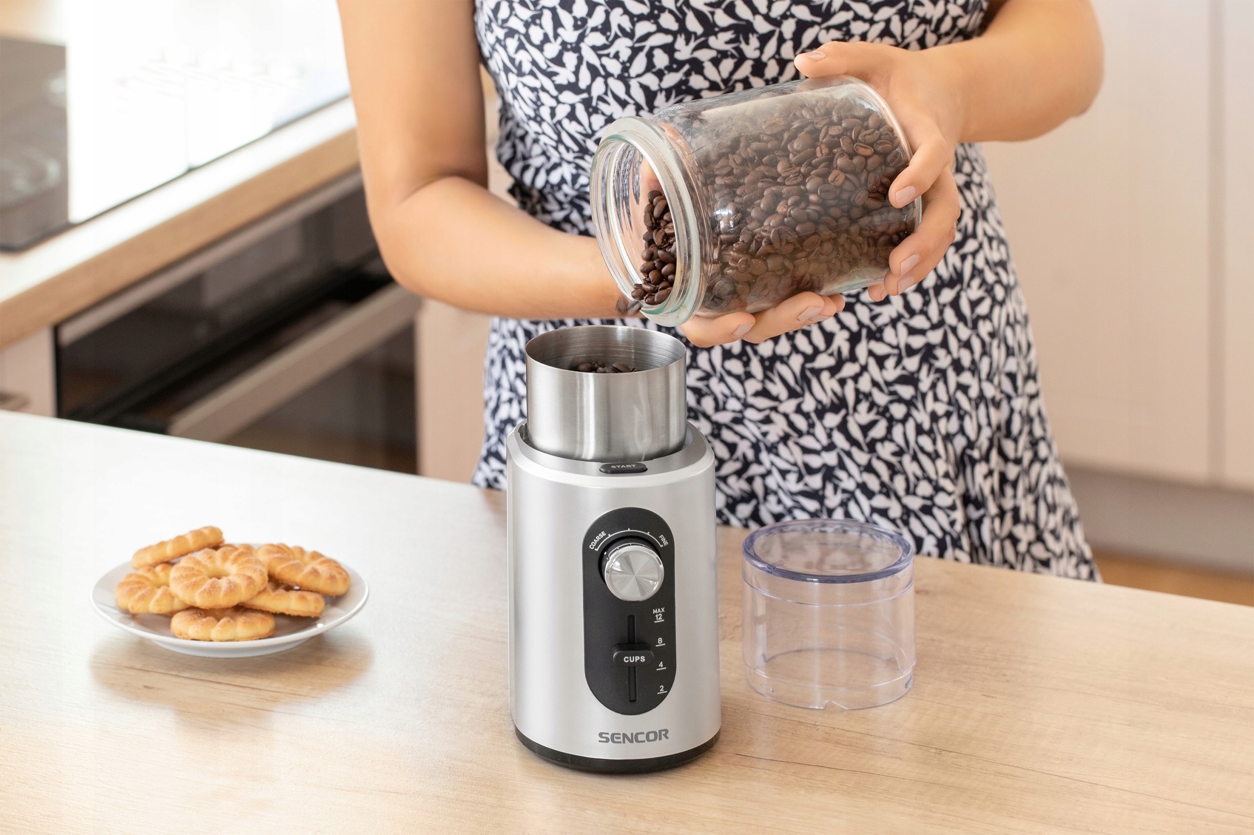 Sencor SCG 3550SS - м'ясорубка, яка може подрібнити 60 грамів кавових зерен. Титанові мелющі дозволяють молоти не тільки смачні кавові зерна, а й горіхи, мак, зелень або спеції. Пристрій працює лише тоді, коли кришка закрита для безпечного використання.