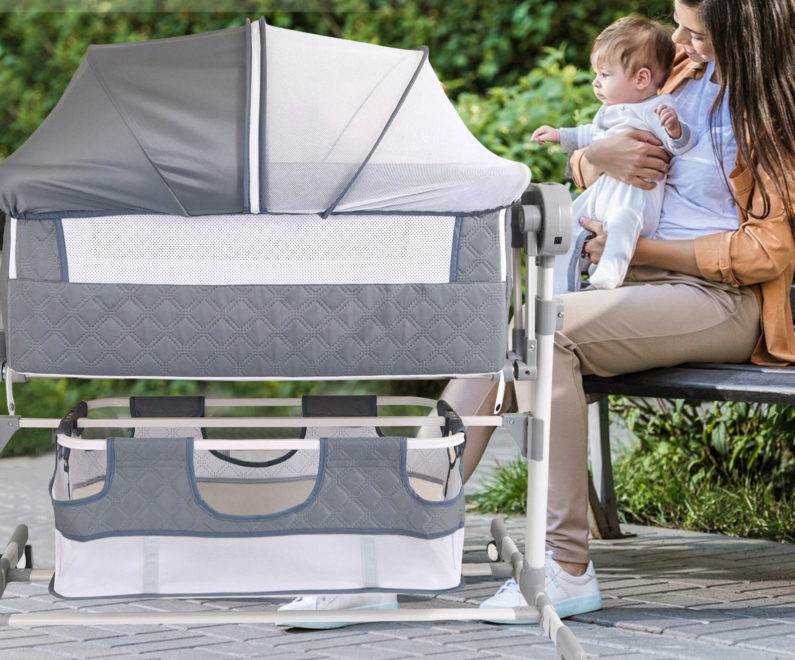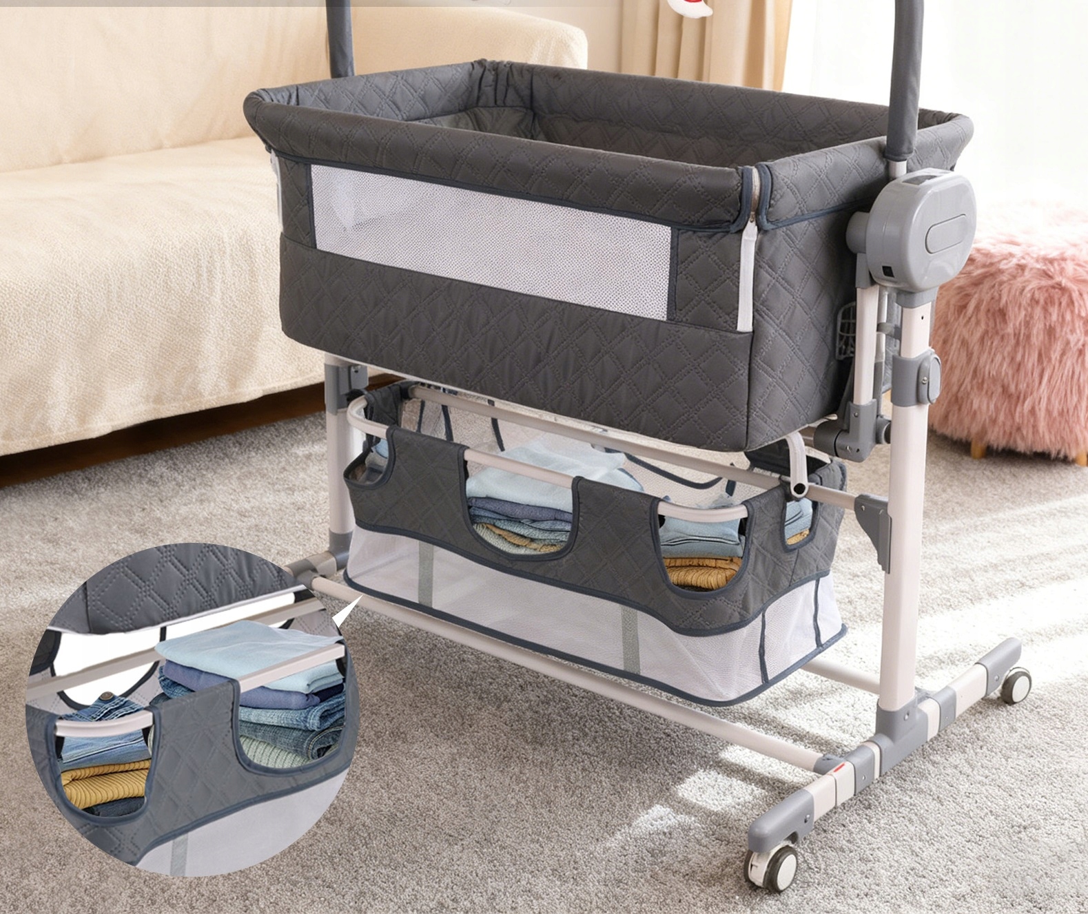 Просторий кошик для зберігання прикріплений до дна люльки, що забезпечує достатньо місця для зберігання необхідних речей для дитини, таких як підгузки, вологі серветки, дитячий одяг, ковдри та пляшечки для годування. Кошик виготовлений з міцної та водонепроникної тканини, яка легко чиститься та витримує щоденне використання. Його велика місткість і легкий доступ усувають потребу в додаткових інструментах для зберігання, зберігаючи дитячі речі впорядкованими та доступними, що значно покращує зручність виховання.