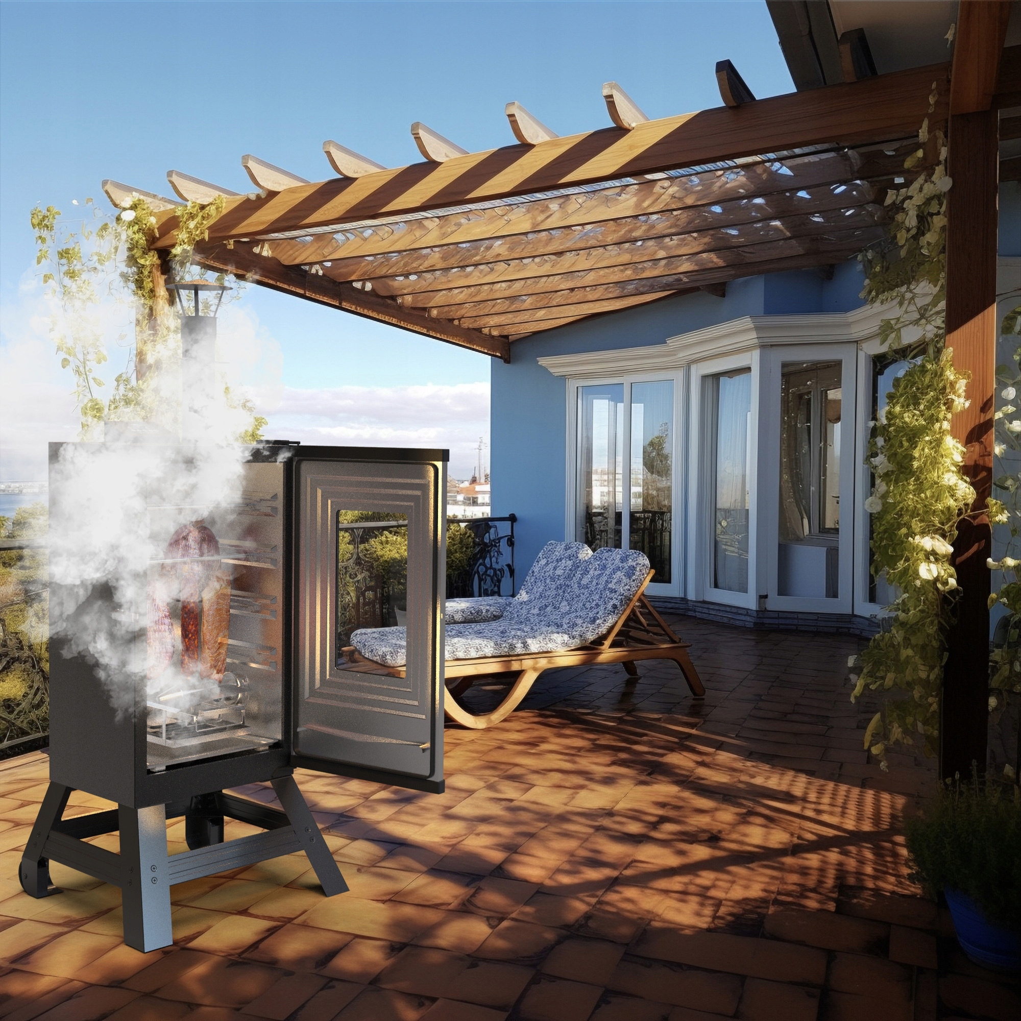 - Все в одному комплекті - коптильня з високим каміном, решітка, металева балки та гаки, димогенератор з електричним насосом, деревна тріска, міцне покриття.