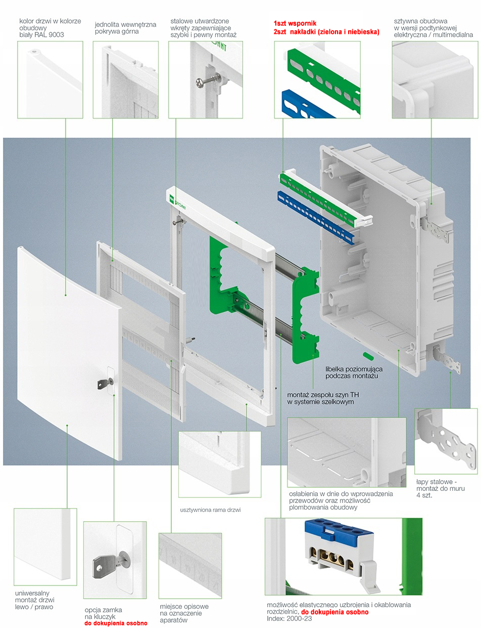 Модель 2435-00 має одинарні двері, оснащені, серед іншого: з клемною колодкою N, PE-рейкою та монтажною рейкою TH35. Він також має знімну систему джгутів DIN-рейок.