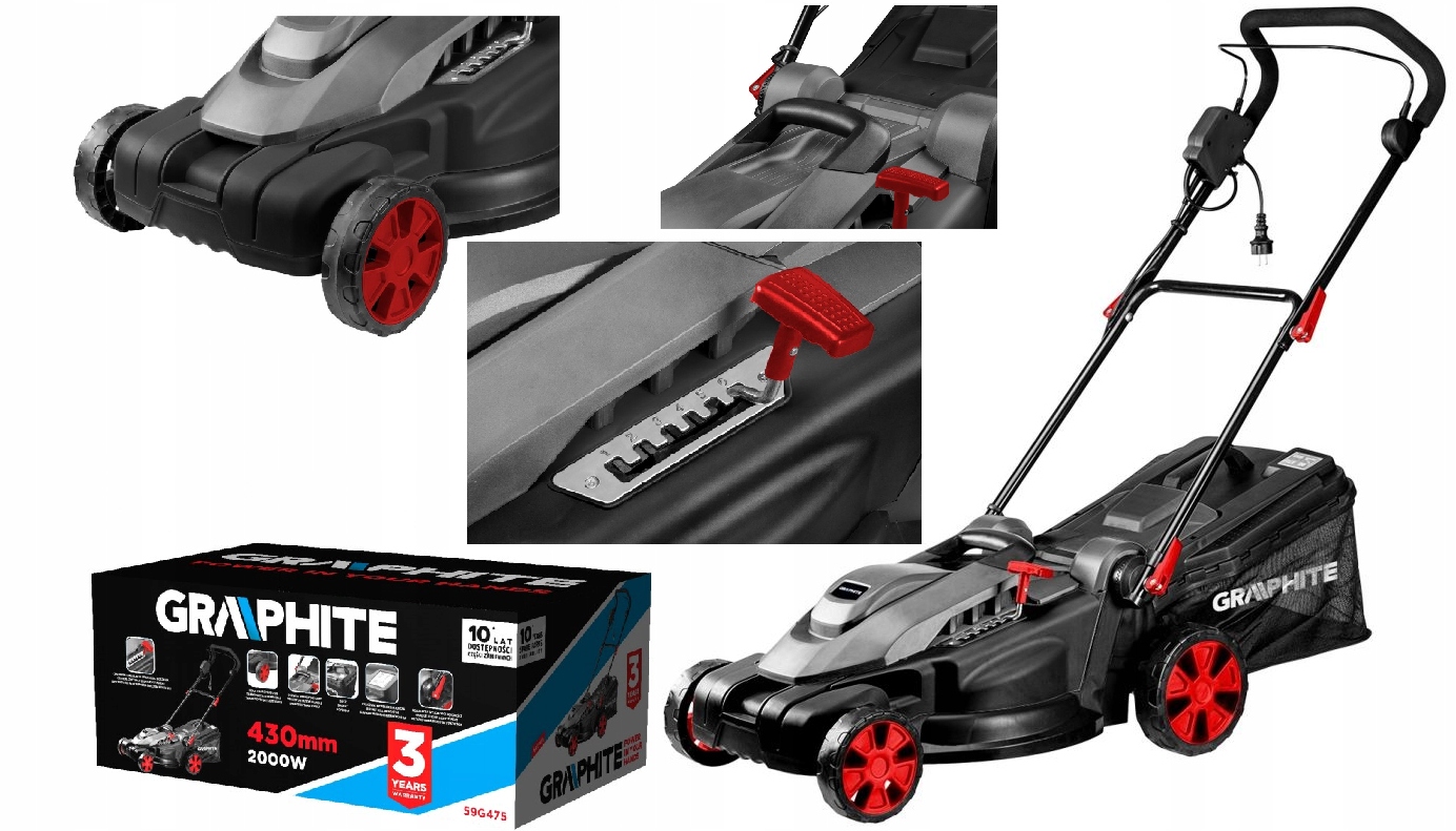 Електрична косарка GRAPHITE з ефективним електродвигуном 2000 Вт дозволяє косити на ширину 430 мм. Має центральне 6-ступеневе регулювання висоти зрізу 20/30/40/50/60/70 м і кошик для трави об'ємом 45 л Ергономічна ручка з перемикачем на всю довжину підвищує комфорт використання. Крім того, перемикач захищений від випадкового включення. Тримач кабелю дозволяє вільно управляти пристроєм. Спеціально профільована кришка кошика забезпечує оптимальний збір скошеної трави, а великі задні колеса дозволяють легко маневрувати. Можливість зручного транспортування за допомогою ручки, розташованої на корпусі. Великою перевагою косарки є її сучасний зовнішній вигляд. Відповідність європейським стандартам безпеки забезпечується сертифікатом CE.