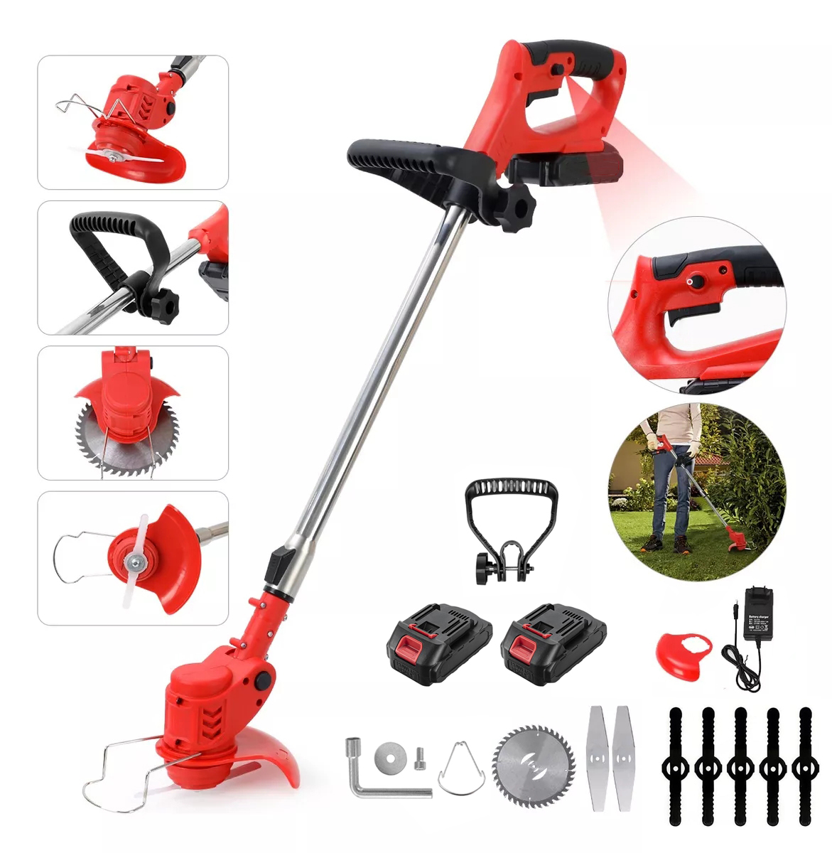 - Шпалери акумулятора постачаються з 3 типами лез: 1 круглої марганцевої сталевої леза, 2 металеві леза, 5 нейлонових лез, міцні та гострих металевих лез, що дозволить швидко вирізати траву швидко.