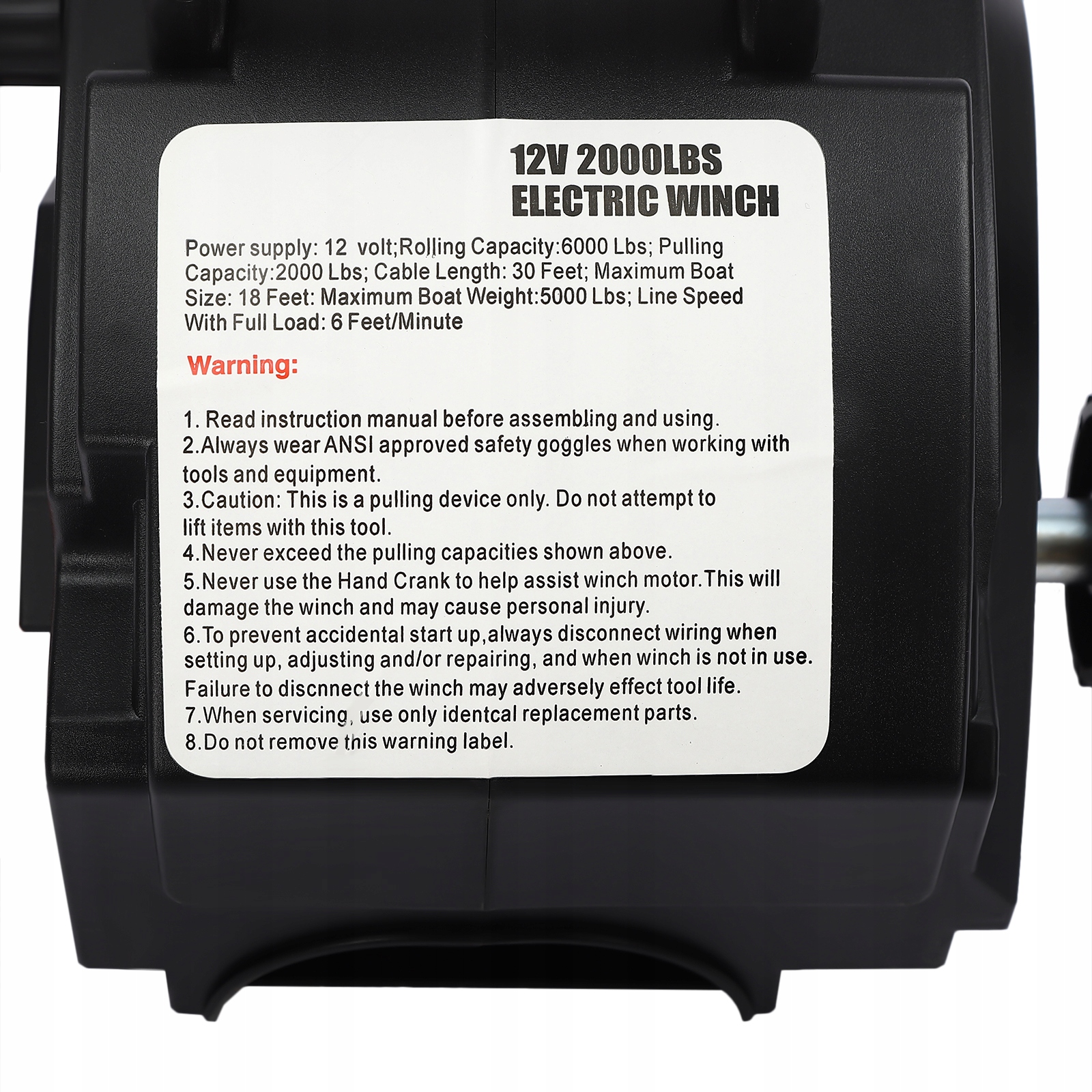 високоякісна матеріал: високоякісна сталь та абс з високою твердістю, міцністю та хорошою корозійною стійкістю та іржею роблять цю лебідку твердою та міцною. Він характеризується високою ефективністю та високою міцністю, що надає лебідці силою прокатки 6000 фунтів, плаваючій силі потягу 5000 фунтів та номінальною силою тягання 2000 фунтів за тягання човна або автомобіля. Лебідка можна використовувати з або без. встановити.
