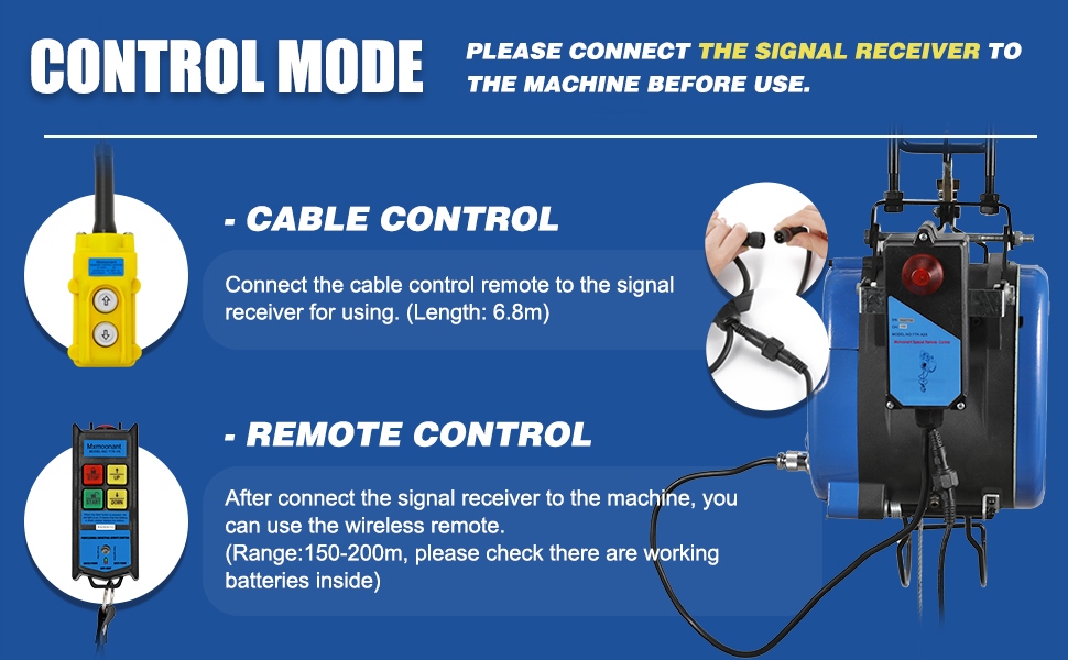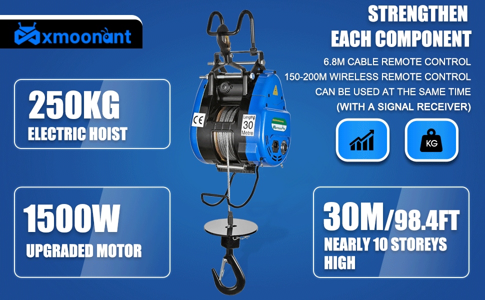 Внутрішнє оновлення: Висока потужність 1500 Вт, тривала протягом багатьох годин безперервної роботи. Спрощений прийомний порт вугільної щітки, без необхідності розібрати машину. Максимальне навантаження 250 кг; Макс. покритий висококваліфікованим алюмінієм стопи з набагато кращою тепловою розсіюванням та кращою міцністю. Контроль 150-200 м. Дуже сумісний гак може бути встановлений більш гнучким. 5-лунковий інтерфейс для дистанційного керування, стабільність та безпека HIGER.
