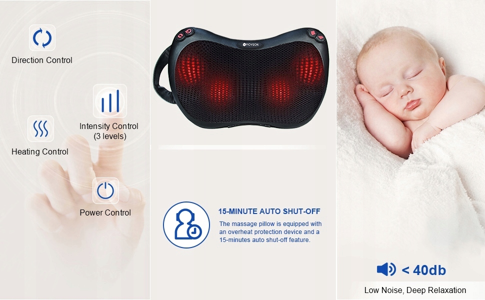 Масажер шиацу MOVEON має унікальний знімний пилозахисний чохол, який кращий, ніж будь-який інший бренд масажних подушок. Масажна подушка оснащена захистом від перегріву і функцією автоматичного відключення на 15 хвилин. Невеликі звуки не впливають на сон. Насолоджуючись штучним масажем, ви зможете міцно спати! Безпечний і зручний у використанні. З (автоматичним) захистом від перегріву та функцією автоматичного відключення на 15 хвилин напрямок можна змінювати автоматично.