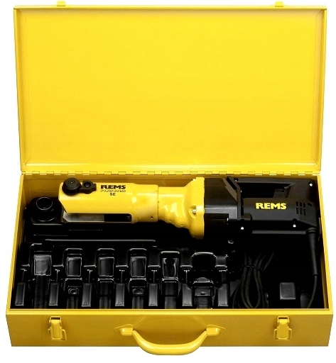 - Електричний радіальний прес для пресових з'єднань Ø 10–108 (110) мм, Ø ⅜ – 4". Для приводу прес-кліщів/обжимних кілець REMS і відповідних прес-кліщів/обжимних кілець інших виробників. Затискач кліщів з автоматичним блокуванням. Електромеханічний привід з ефективним універсальним двигуном 230 В, 50–60 Гц, 450 Вт, з необслуговуваним Зубчаста і запобіжна муфта, система подачі - із захистом від перевантаження. Без затискних штифтів