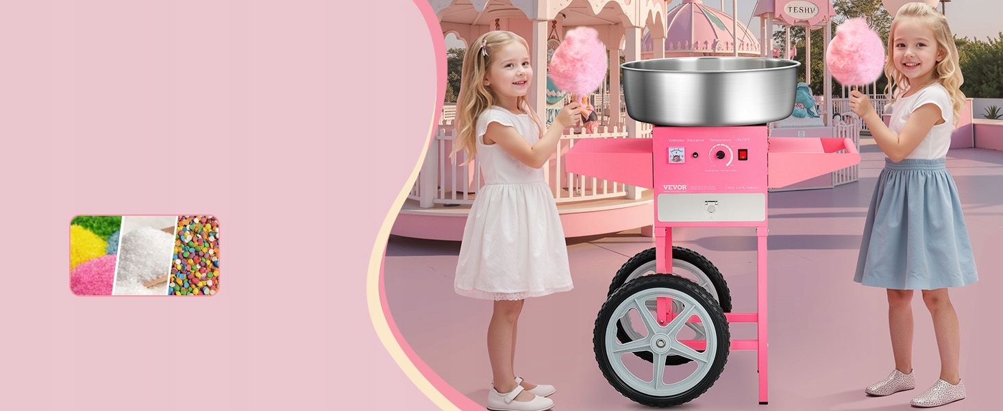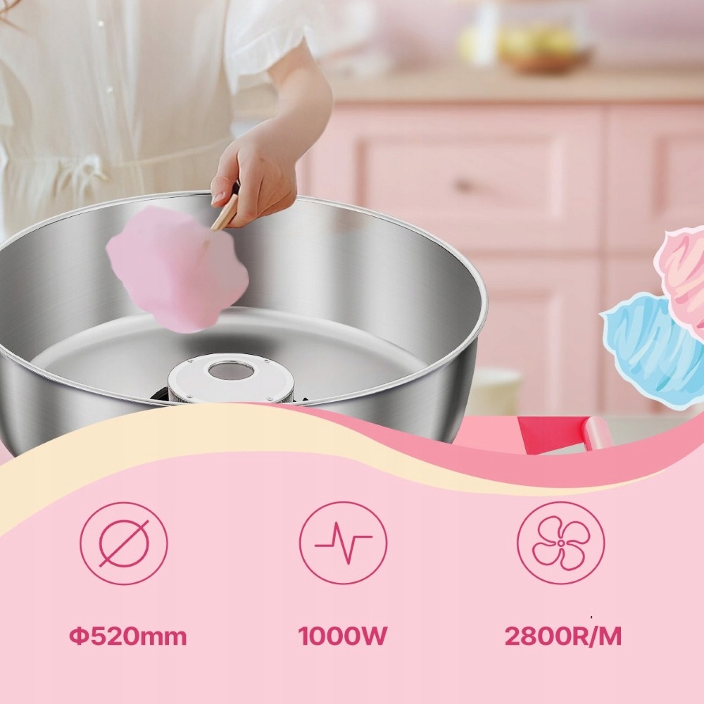 Ця машина для солодкої вати має двигун потужністю 1000 Вт і більшу чашу для цукерок, яка подає приблизно 6 цукерок за хвилину. Прилад може безперервно працювати протягом години. Він ідеально підходить для різних вечірок і підходить для більшості видів цукру.