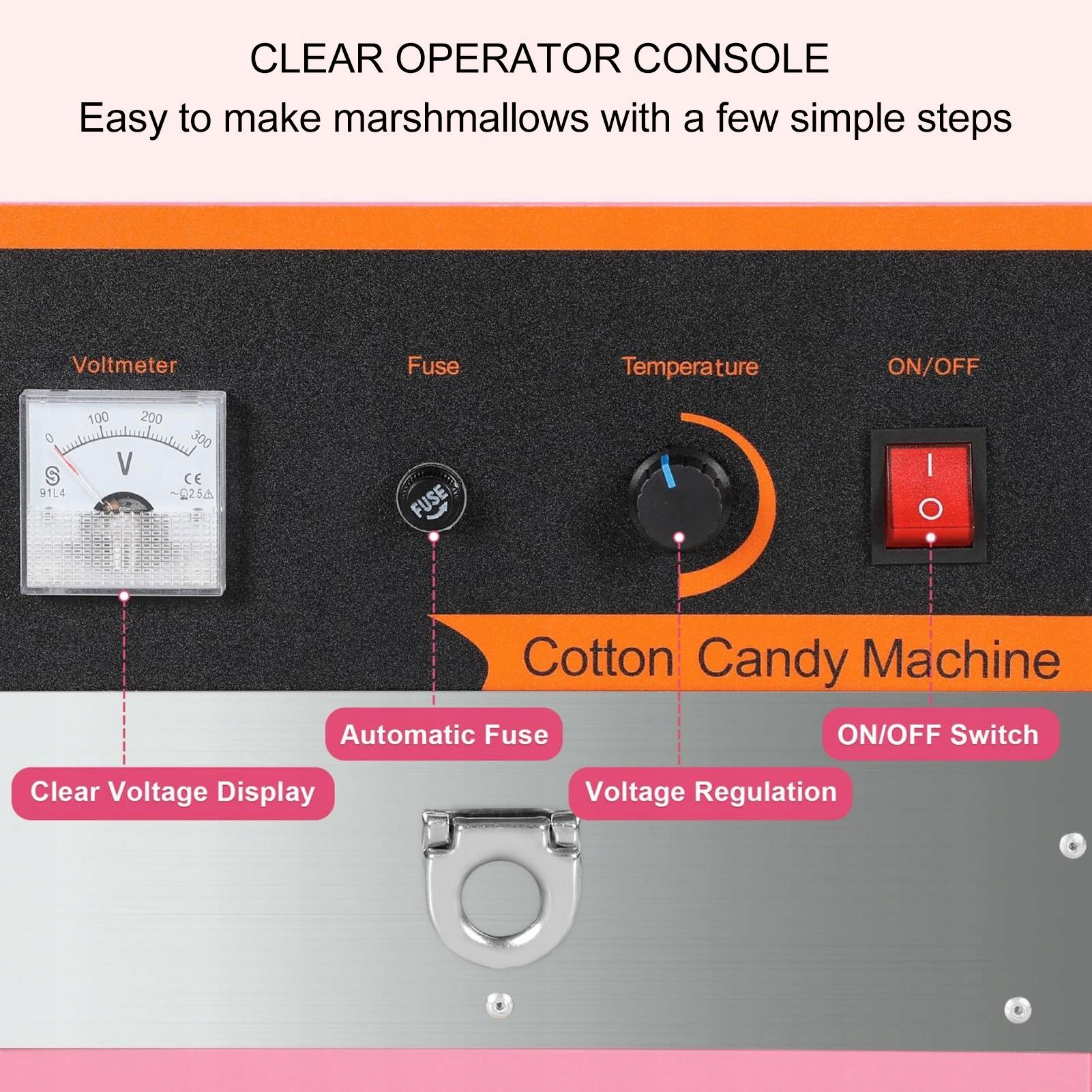 2. Матеріал із нержавіючої сталі: виробник солодкої вати постачається з великою 21-дюймовою чашею з нержавіючої сталі, яка забезпечує безпеку їжі та легке очищення. Він також має бічні затискачі, які стабілізують машину та зменшують вібрацію, забезпечуючи стабільну роботу.