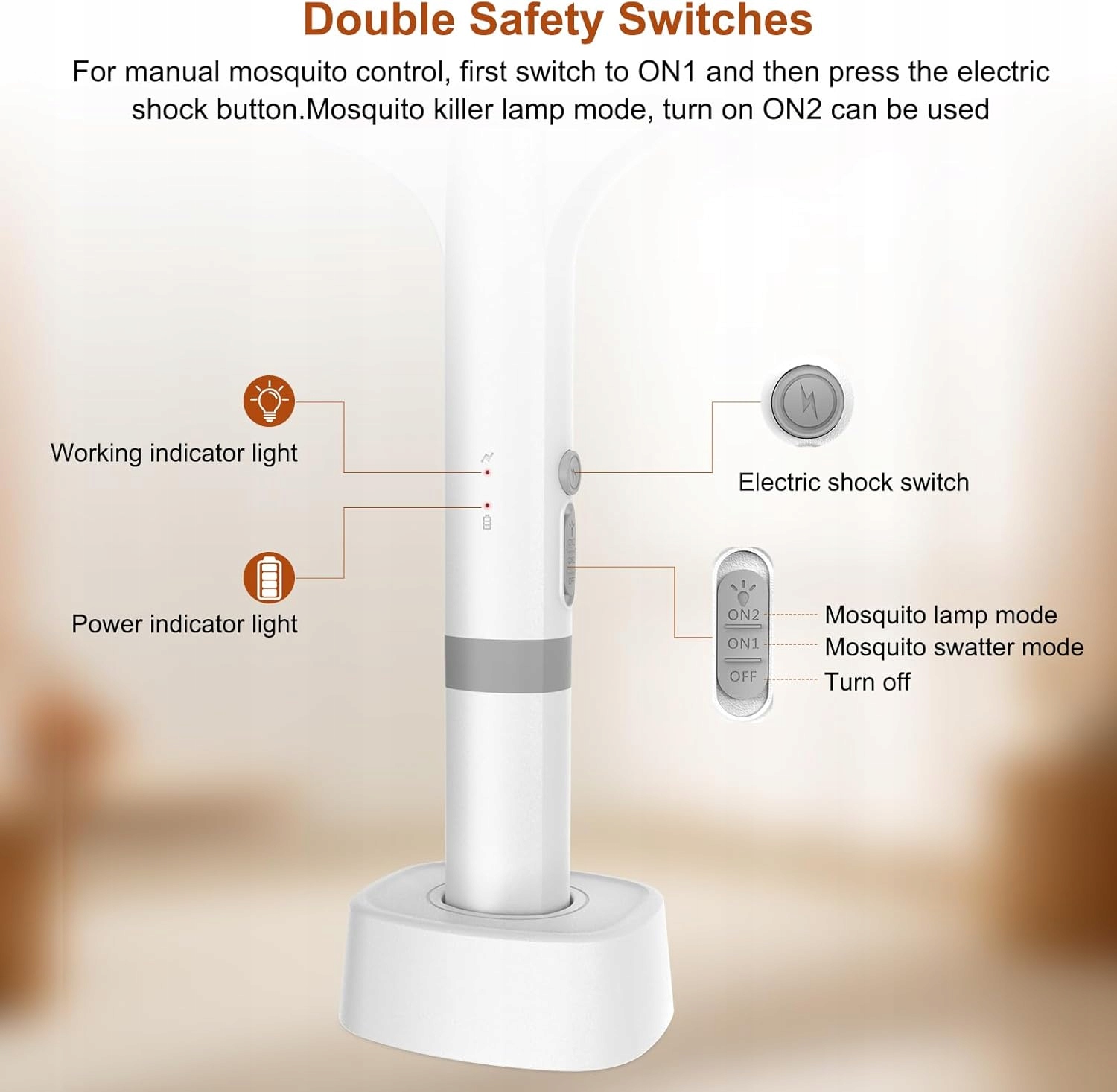 Електричний москітний пристрій використовує сітку 5000 В, яка миттєво вбиває комарів, комах, мух, мошок, плодових мушок та інших шкідників. Порівняно з іншими відлякувачами з нижчою напругою, це значно підвищує ефективність боротьби з комарами.