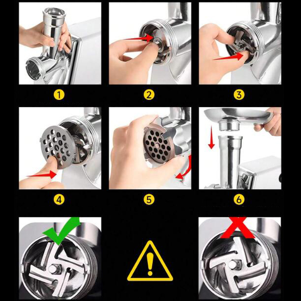 🥗wyposażony w czterosieczne ostrze i technologię compresji spiralnej, może szybko mielić mięso. czyszczeniu, wystarczy przetrzec szmatką zwilżoną ciepą wodą z mydłem. (Uwaga: Częci Aluminiowych nie należy wkładac do Zmywarki, ponieważ spowoduje to uszkodzenie warstwy tlenku glinu i odbarwienie aluminum.)