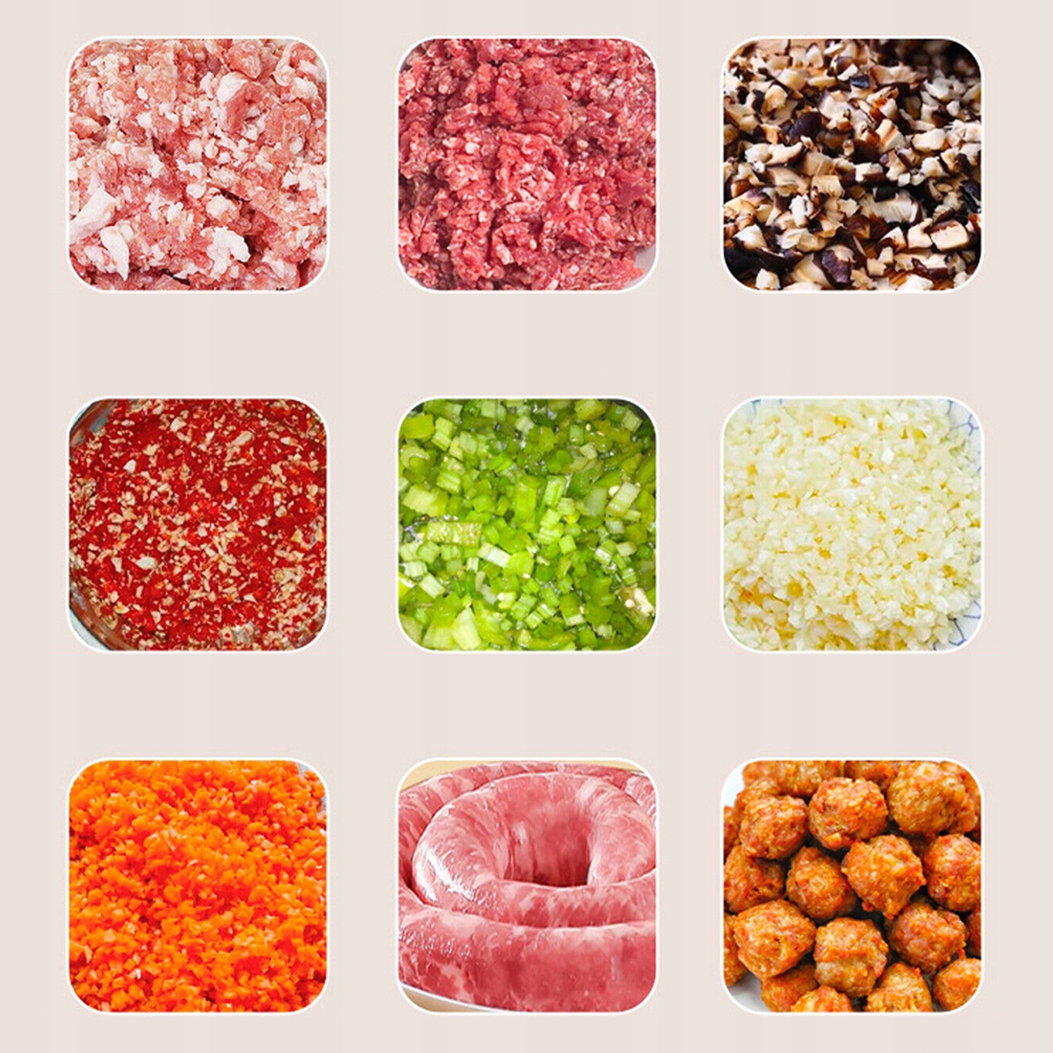 Сумісність з багатьма інгредієнтами: ця машина буде впоратися не лише з сирим м'ясом, але і з вареними овочами та рибою, а також інгредієнтами, такими як гриби, перець та часник. Цей універсальний пристрій збільшує ефективність приготування їжі.