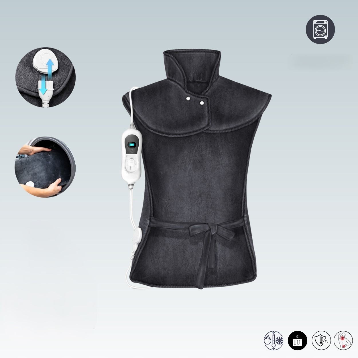 - для всіх - 3 температури: Теплова подушка має 3 різні рівні нагріву, освітлений пульт дистанційного керування та потужність 100 Вт, що нагрівається до потрібної температури протягом 10 хвилин. Розміри нагрівальної подушки: 60x85 см, смужки: кожні 60 см завдовжки пухнастий, приємний і м'який матеріал, який можна промивати в пральній машині.