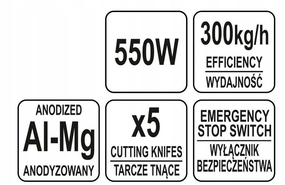 Використання двигуна потужністю 550 Вт забезпечує високу ефективність, що досягає 300 кг/год. Це дозволяє дуже швидко нарізати велику кількість овочів, що особливо важливо для професійних користувачів.