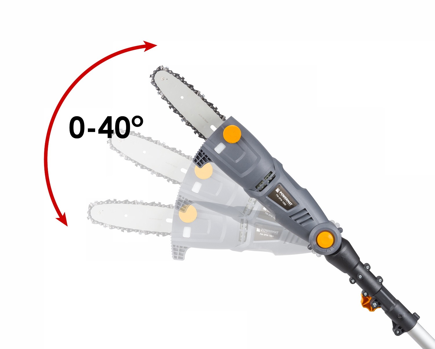 Електропила на стовпі з триступеневим регулюванням нахилу POWERMAT PM-EPW-1000 з високоякісною направляючою шиною та ланцюгом. Можливість швидкого і легкого регулювання довжини стріли в діапазоні від 184 см до 240 см і можливість регулювання кута ріжучої головки в три етапи значно полегшує обрізку дерев. Електродвигун 1000 Вт дозволяє зрізати товсті гілки завдяки запасу потужності.