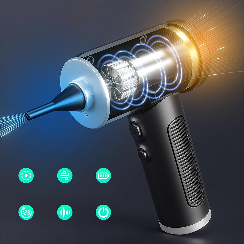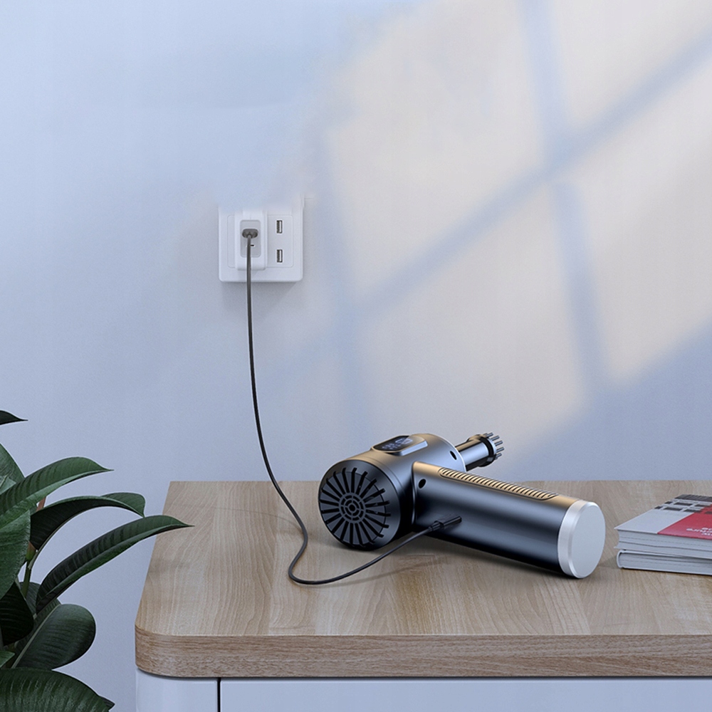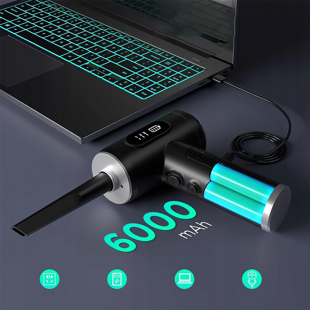 На відміну від традиційного дротового пилососа, наш пилосос зі стисненим повітрям оснащено акумулятором ємністю 6000 мАг і роз’ємом для швидкого заряджання Type-C, який можна заряджати у будь-який час через ноутбуки, комп’ютери, мобільні пристрої, автомобільні зарядні пристрої, адаптери живлення тощо. Його можна використовувати безперервно протягом 30 хвилин після повного заряджання, що полегшує пилососіння вдома чи в офісі.