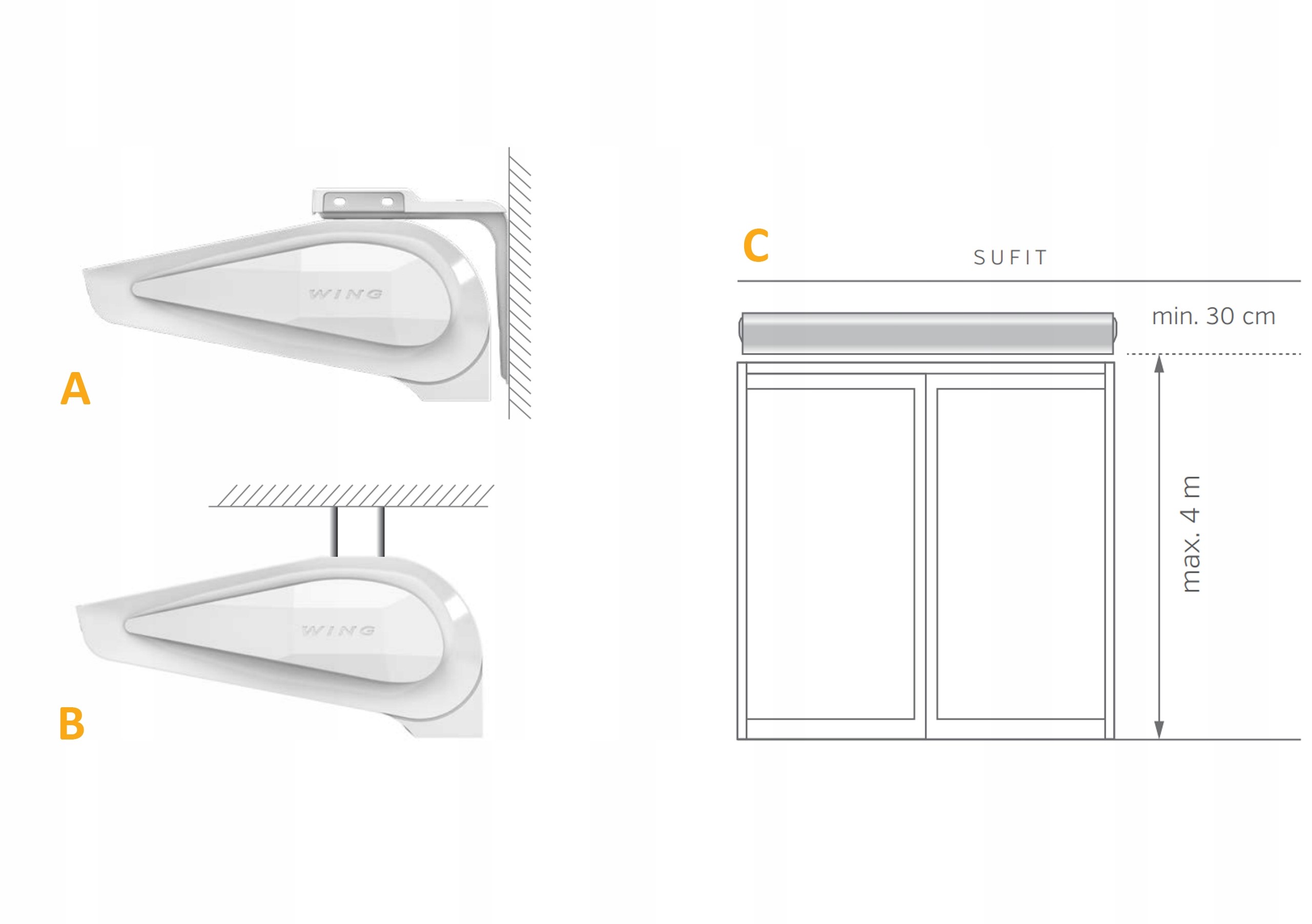 Повітряні завіси WING можна монтувати горизонтально або вертикально*. Завдяки тонкій формі, надзвичайно низькій висоті корпусу та похилому повітрозабірному отвору його можна встановити в дуже обмеженому просторі над дверима, не впливаючи на його продуктивність.