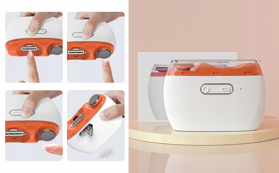 - Є вбудований контейнер для сміття нігтів. Коли кусачка для нігтів працює, вона автоматично засмоктує залишки обрізаних нігтів у контейнер для зберігання, щоб підтримувати навколишнє середовище чистим і санітарним. Після різання ви можете очистити його щіткою, яка входить у комплект.