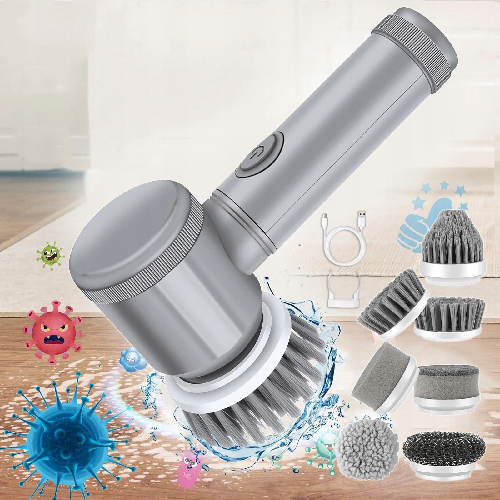 Електрична обертова щітка для чищення оснащена 6 різними типами високоякісних змінних насадок для щіток, які можуть задовольнити різні потреби в різних сценаріях. За допомогою цих різних насадок для щіток ви можете чистити раковини ванної кімнати, кухні, решітки, духовки, сильно змащені маслом стіни, водостоки, раковини, підлогу, розчин, ванни, унітази, колеса автомобілів, підлоги, вікна, вікна, посуд тощо. Ручка економить місце та робить цю щітку для чищення більш доступною.
