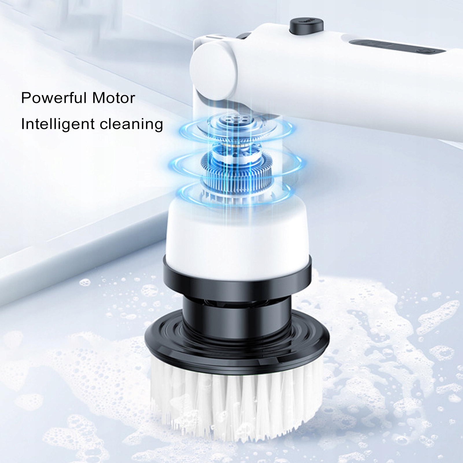 - Під’єднайте дві ручки до головного блоку, виберіть потрібну насадку для чищення та встановіть її на головний блок. Натисніть і утримуйте кнопку живлення протягом 3 секунд, щоб запустити машину на першій передачі. Натисніть кнопку живлення, щоб відрегулювати передачу (всього є 3 передачі). Після використання негайно очистіть щітку для чищення та покладіть її в добре провітрюване приміщення для висихання, щоб підготувати до наступного використання.