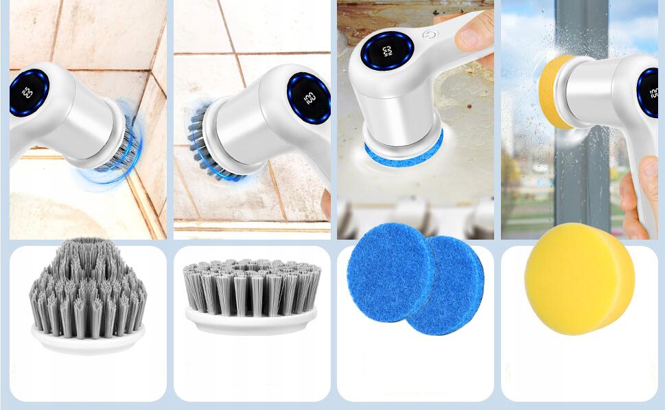 💪З 5 насадками щітки та 1 насадкою на липучці різних форм і розмірів для чищення всіх типів поверхонь. Плоска головка щітки ідеально підходить для чищення великих поверхонь, таких як підлога, душ і ванна. Головка кутової щітки призначена для очищення країв, кутів і коліс автомобілів. Губка ідеально підходить для очищення скляних поверхонь і столів. Щітка для чищення добре видаляє кухонний бруд.