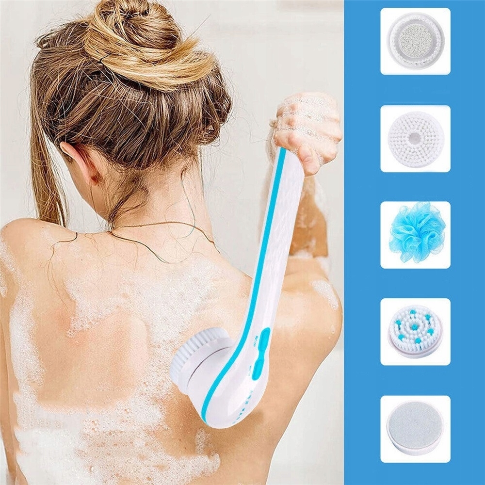 Електрична щітка для ванни з 5 змінними головками та довгою ручкою 36 см. З функціями автоматичного гелю, масажу та пілінгу. Працює від батарейок, ідеально підходить для щоденного догляду за тілом усієї родини.