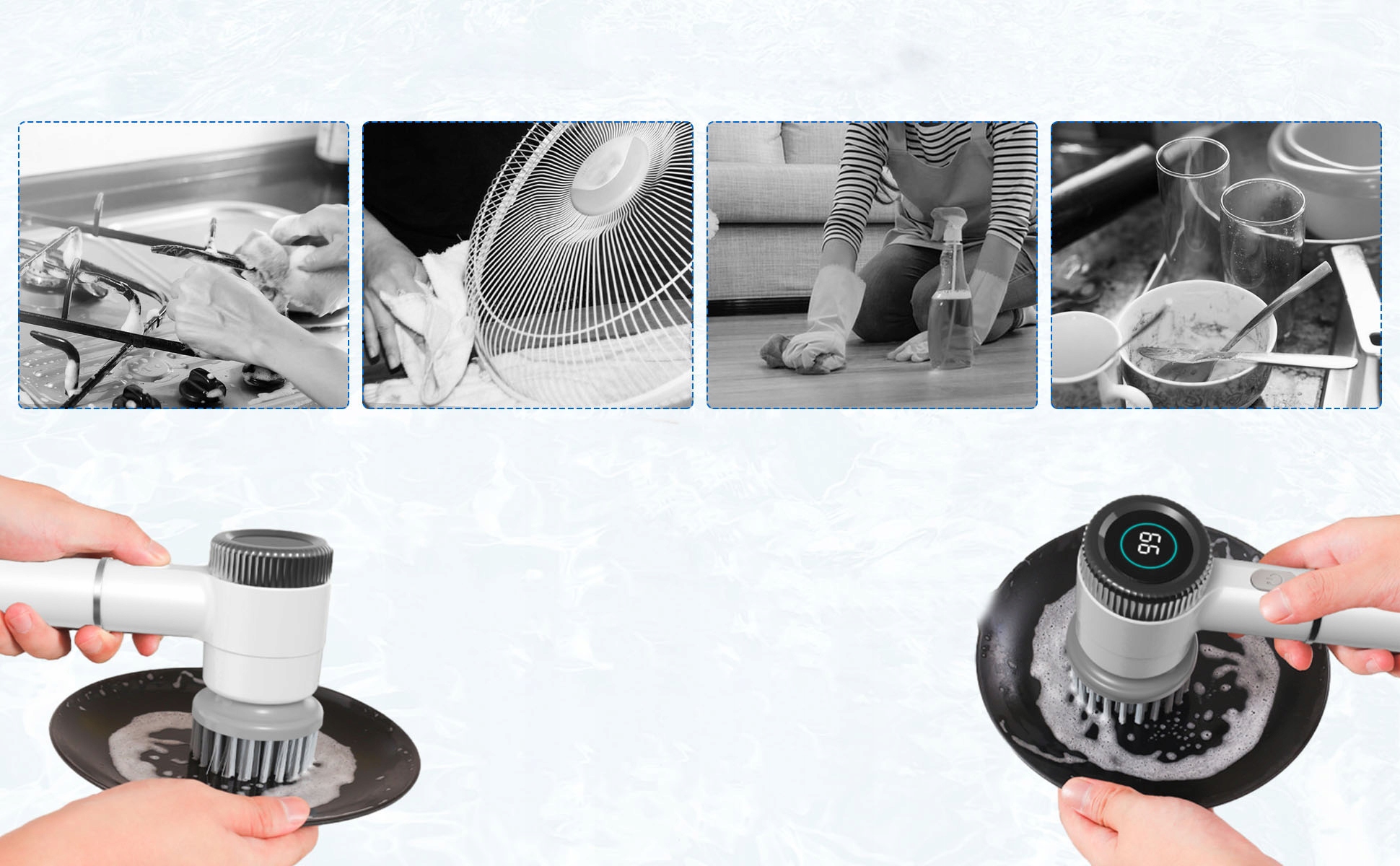 🧼 Багатофункціональні чистячі насадки: Набір включає щітку з щетиною, дротяну щітку, губчасту насадку, волокнисту насадку та абразивну губку — ідеально підходить для видалення бруду та плям на різних поверхнях.