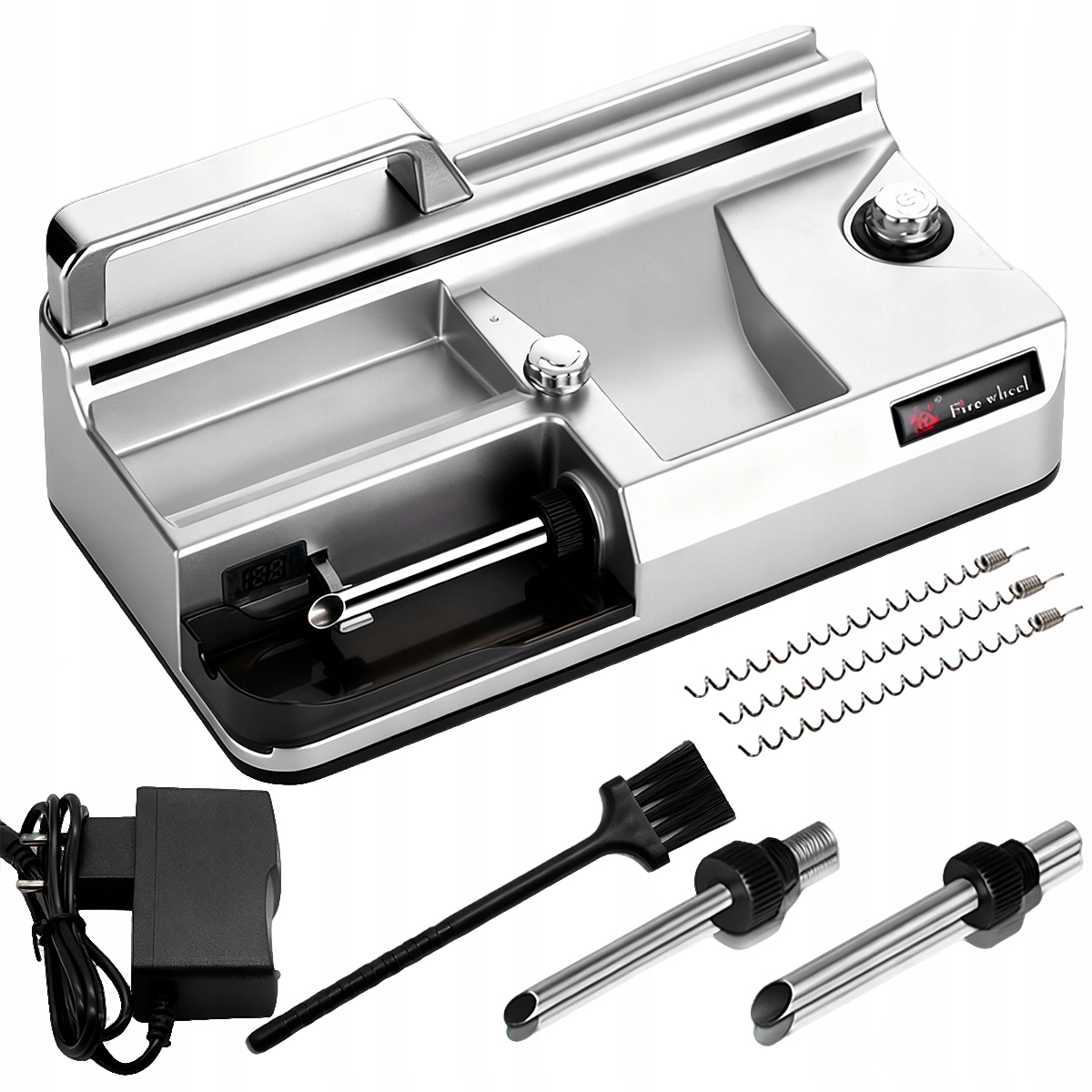 Електрична подача/ролик оснащений блоком живлення, щіточкою для чищення, трамбівкою та трьома змінними наконечниками різного діаметру. Він простий у використанні та експлуатації, що робить його ідеальним подарунком для любителів готових сигарет.