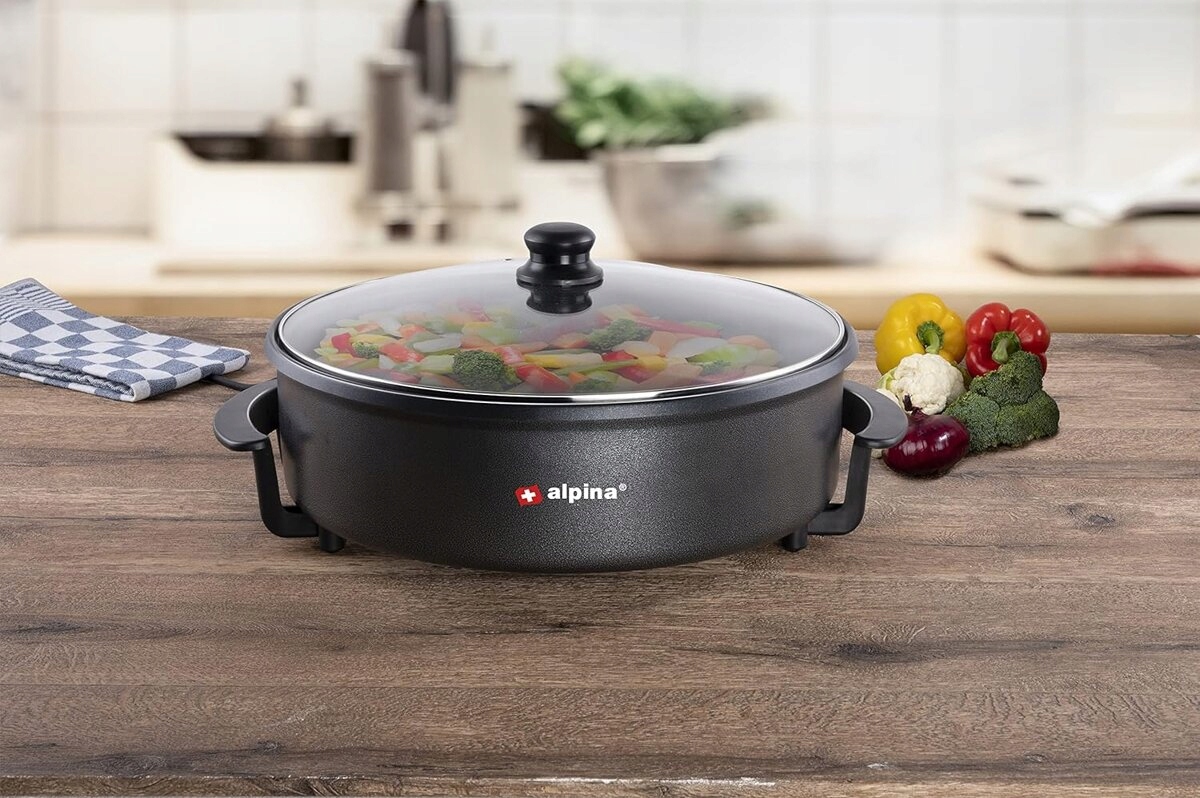 Електрична сковорода ALPINA DV-4042 потужністю 1500 Вт має антипригарну поверхню і знімний термостат з плавним регулюванням. Велика багатофункціональна сковорода з високим краєм (Ø 42 см)