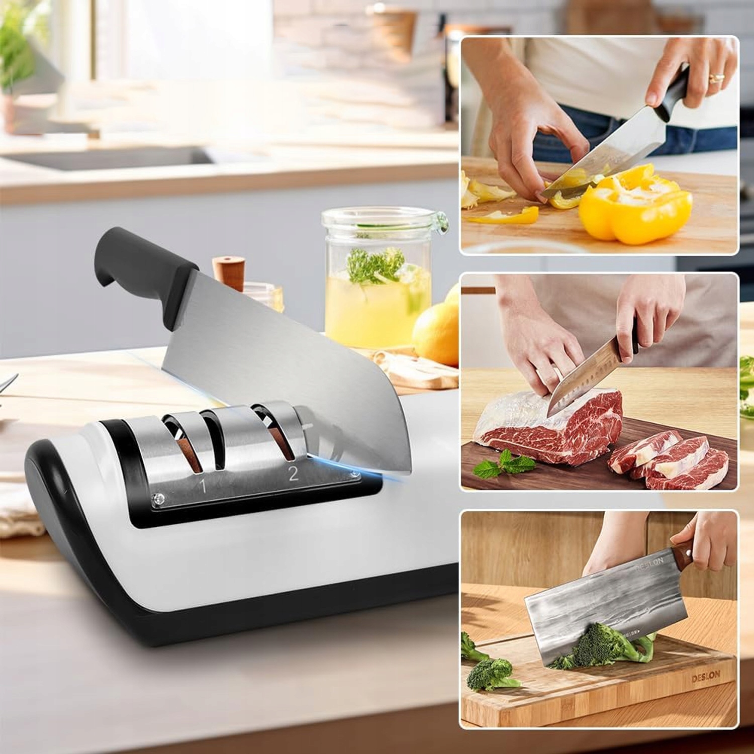 💡💡Ця точилка має 2-ступеневу (4-ступеневу) систему заточування. Кожен крок, від грубого до тонкого, допомагає відновити ідеальне лезо багатьох типів ножів. Насолоджуйтеся професійним заточуванням вдома. (Точилка не підходить для зубчастих і керамічних ножів).