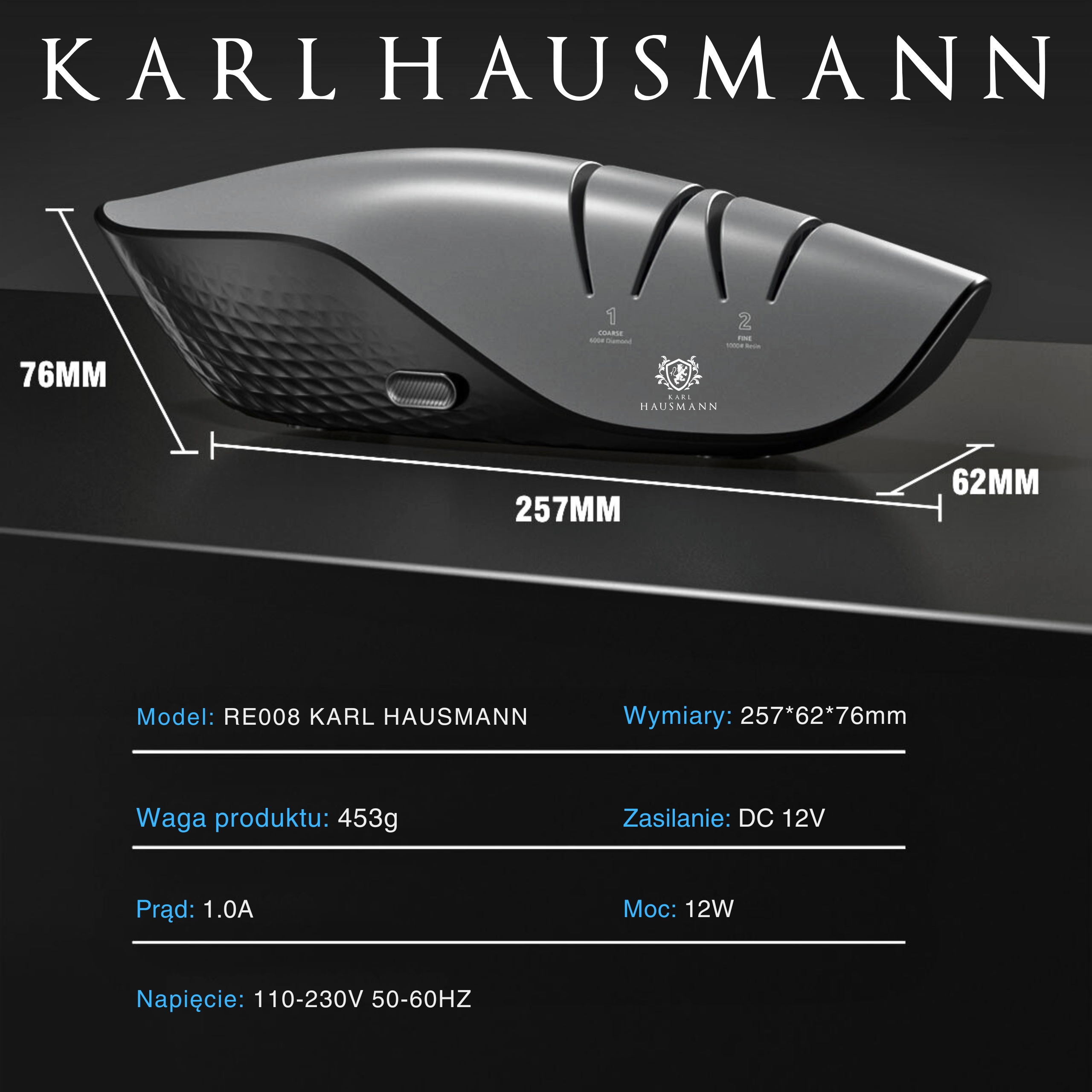 Заточка працює на основі електричного механізму (DC 12V, потужність 12W), завдяки якому заточування ножа відбувається швидко, рівномірно та без зусиль.