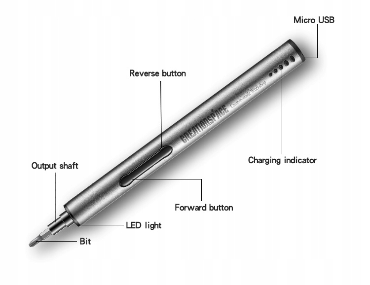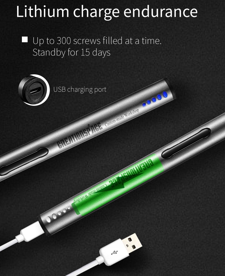 Викрутка живиться від вбудованого літій-іонного акумулятора ємністю 260 мАг, який заряджається від порту microUSB.