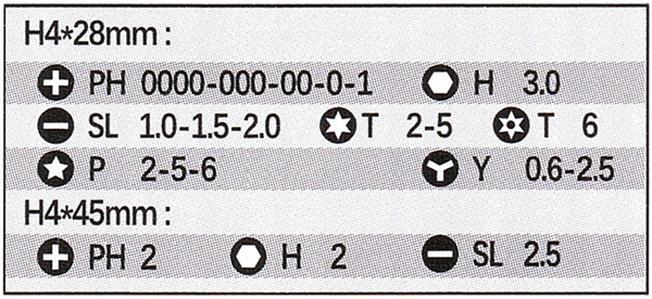 - 20 біт, довжиною 28 і 45 мм і монтажною шириною 4 мм,