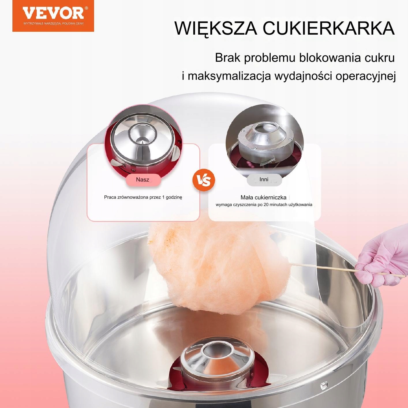 Ця ватна машина має двигун 1000 Вт і більшу чашу з цукерками , яка забезпечує близько 6 ват цукру в хвилину. Пристрій може працювати постійно протягом години. Він ідеально підходить для різних подій і підходить для більшості видів цукру.