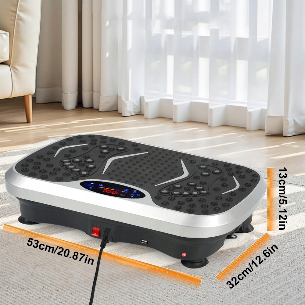 Ця вібраційна тренувальна панель має компактний дизайн – невеликий розмір і мала вага спрощують використання та транспортування. Він оснащений РК-дисплеєм, який постійно відображає швидкість тренування, час, режим і витрачені калорії. Тонкий футляр із нижньою ручкою для зручності перенесення; Коли він не використовується, його можна заховати під диван, заощаджуючи місце у вашому домі. Ідеально підходить для нарощування сили, схуднення, спалювання жиру та розслаблення м’язів – це ідеальний вибір для різноманітних ефективних домашніх тренувань.