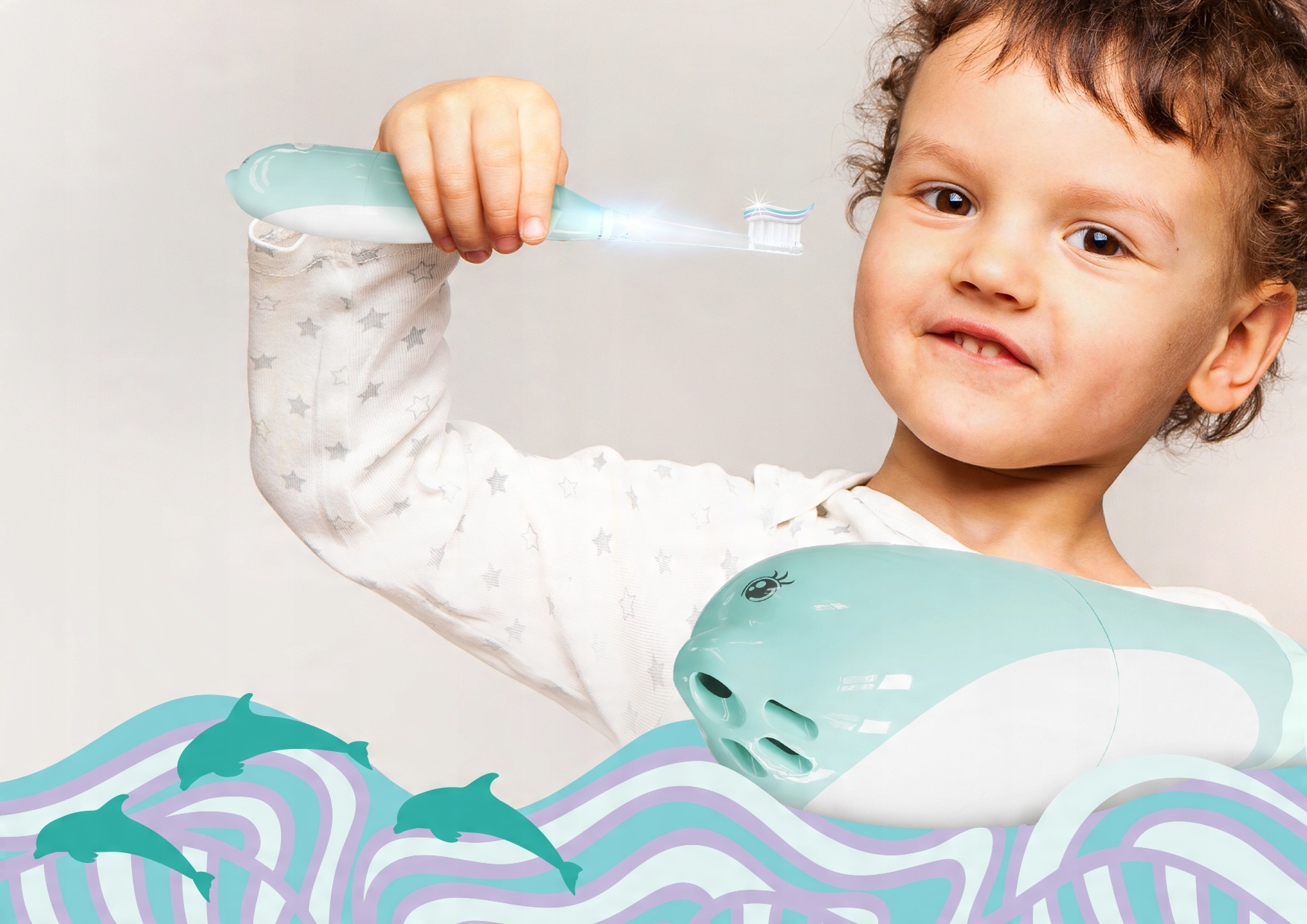 Знайомий з водою дельфін швидко допоможе вашому малюку дізнатися секрети правильного поводження чищення зубів.