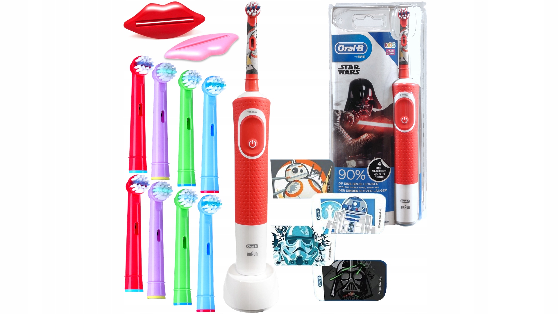 - Входить до комплекту b> включає: електричну зубну щітку, зарядний пристрій, 4 наклейки для зубних щіток, 8 змінних наконечників, 2 вичавки для зубної пасти.