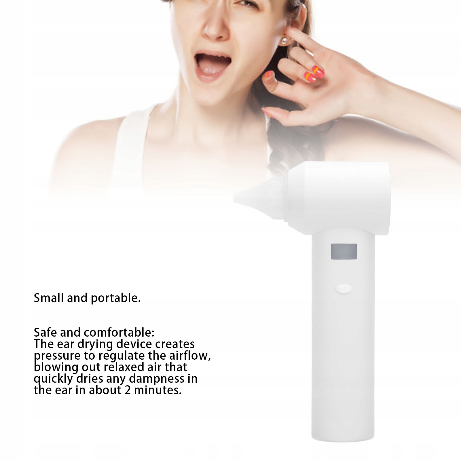 2. Портативна конструкція: Ця компактна сушарка для вуха проста у використанні і комфортно вписується в руку або кишеню, що робить його дуже подорожуючим супутником для догляду за вухом.