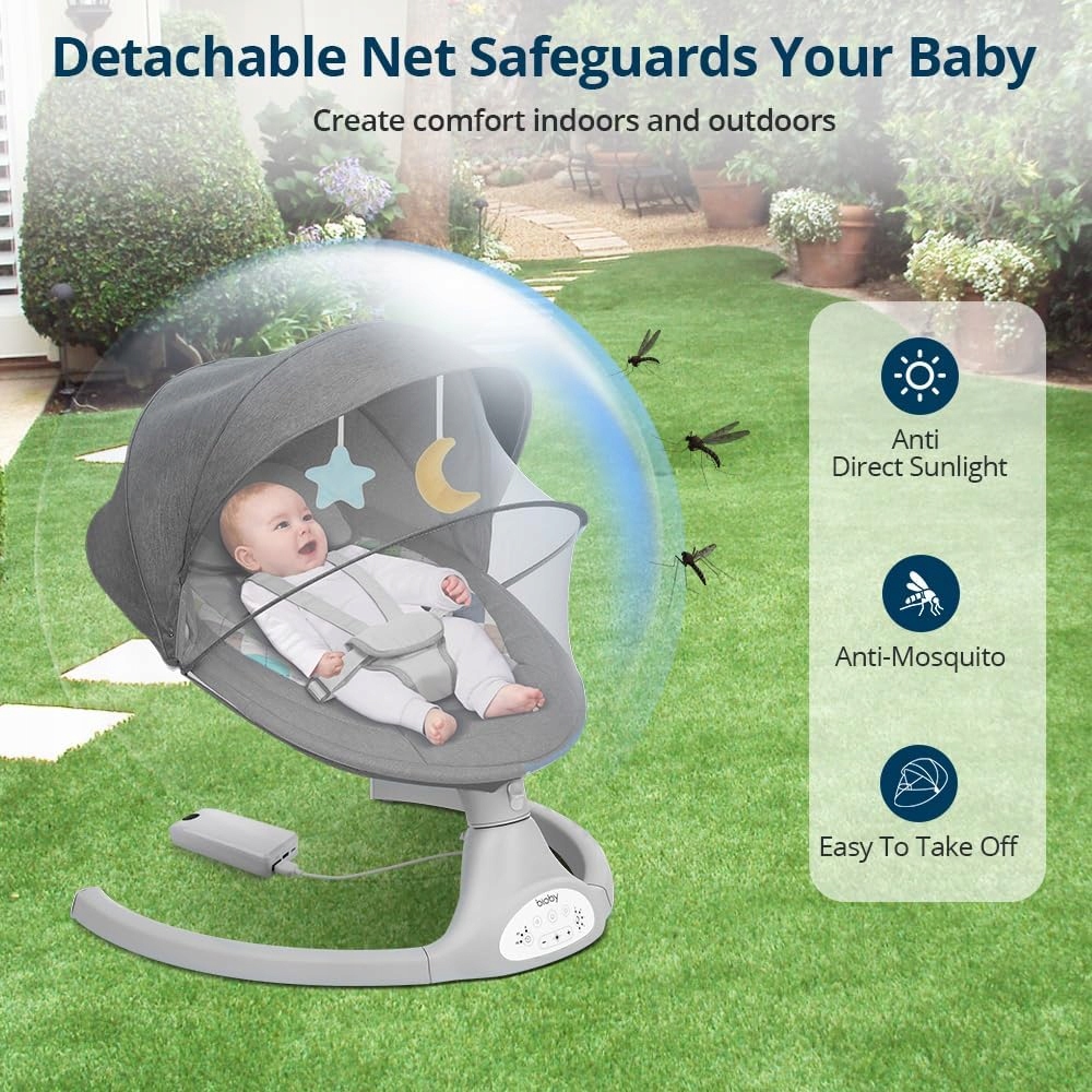 - Інтелектуальний контроль: Bluetooth Music and Time Налаштування: Підключіть смартфон через Bluetooth, щоб слухати розслаблюючу музику або власні списки відтворення. Керування електричним розмаху для немовлят із сенсорним екраном або за допомогою кріпленого пульта дистанційного керування. Три запрограмовані таймери (15/15/30 хв) допомагають оптимізувати споживання енергії під час ніжного коливання дитини.