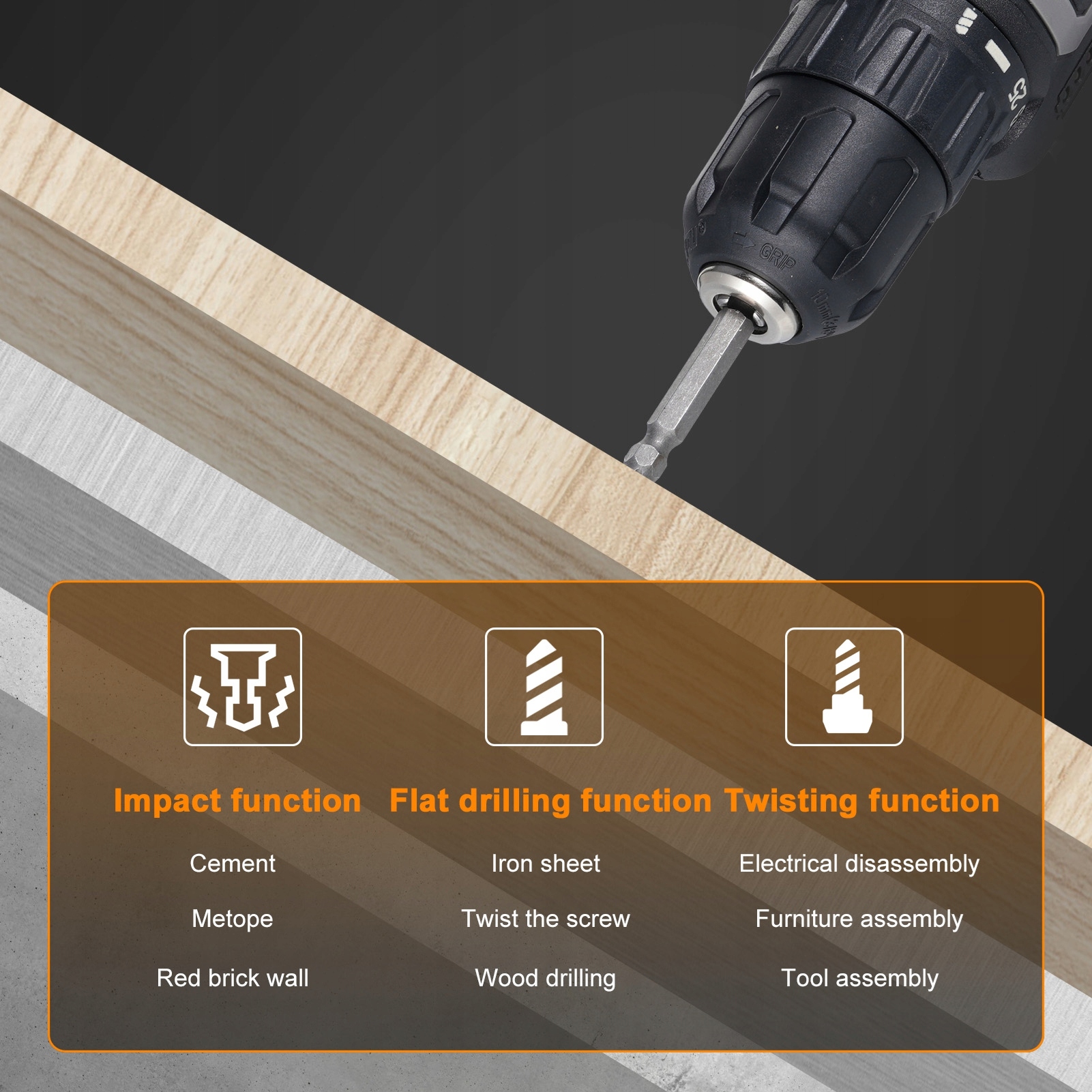 1. 25+1 Налаштування крутного моменту з подвійною швидкістю та нескінченно управління змінною швидкістю: Налаштування крутного моменту 25+1 Дозволяє точного контролю над бурінням та рушійною силою, що робить його придатним для широкого спектру матеріалів, включаючи деревину, металу та стіни. Подвійна швидкість та нескінченно змінне управління швидкості забезпечують регулювання швидкості свердління, щоб відповідати завданням, забезпечуючи оптимальну ефективність та зменшення ризику пошкодження матеріалів або демонтованих гвинтів.