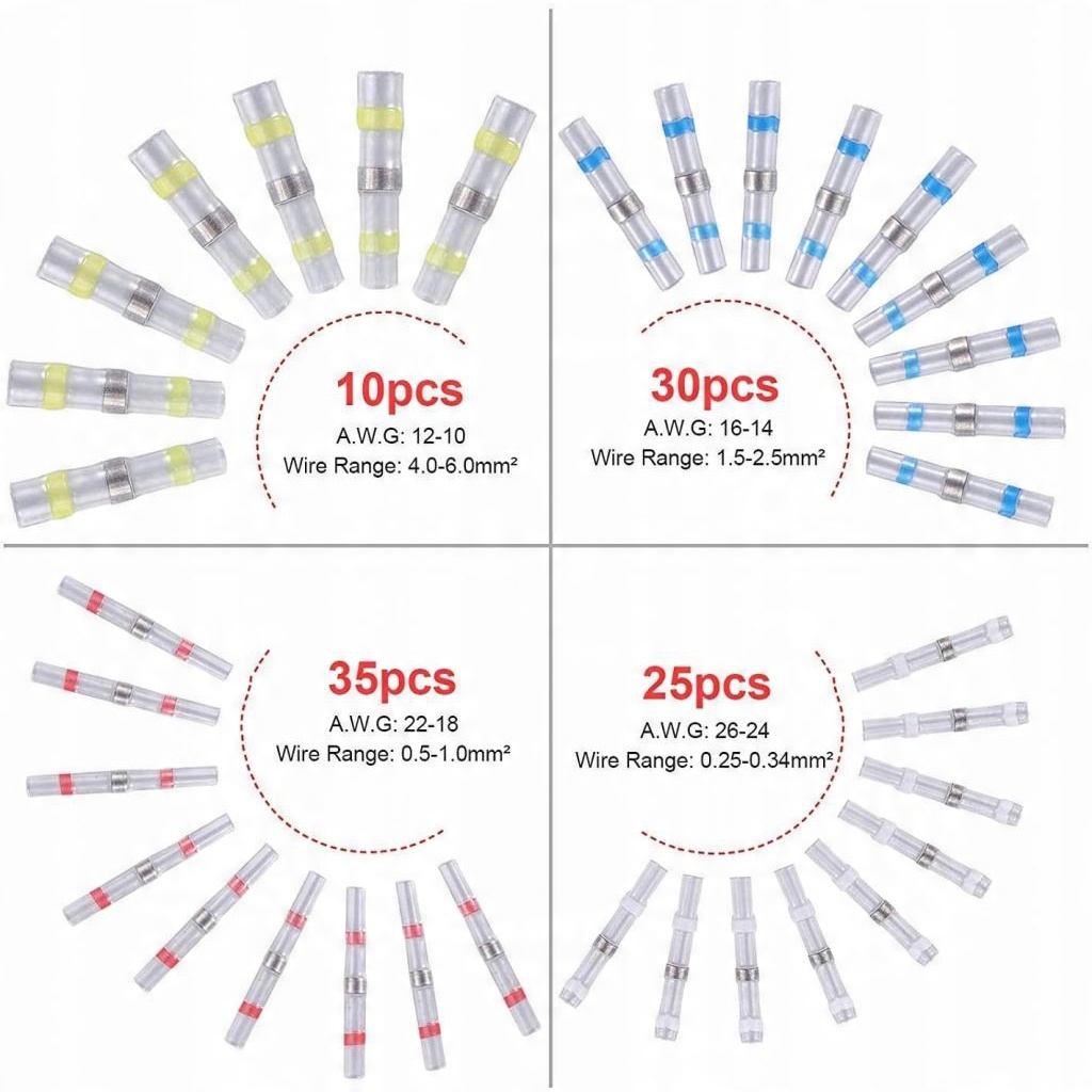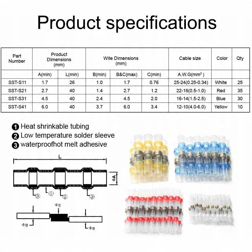 【З’єднувач контактної трубки】Зменшений у розмірі, він плавиться та циркулює крізь паяні дроти для утримання – ваш провід ніколи не зісковзне з роз’єму. Ідеально підходить для морських і автомобільних застосувань. Параметри *Матеріал: мідь луджена