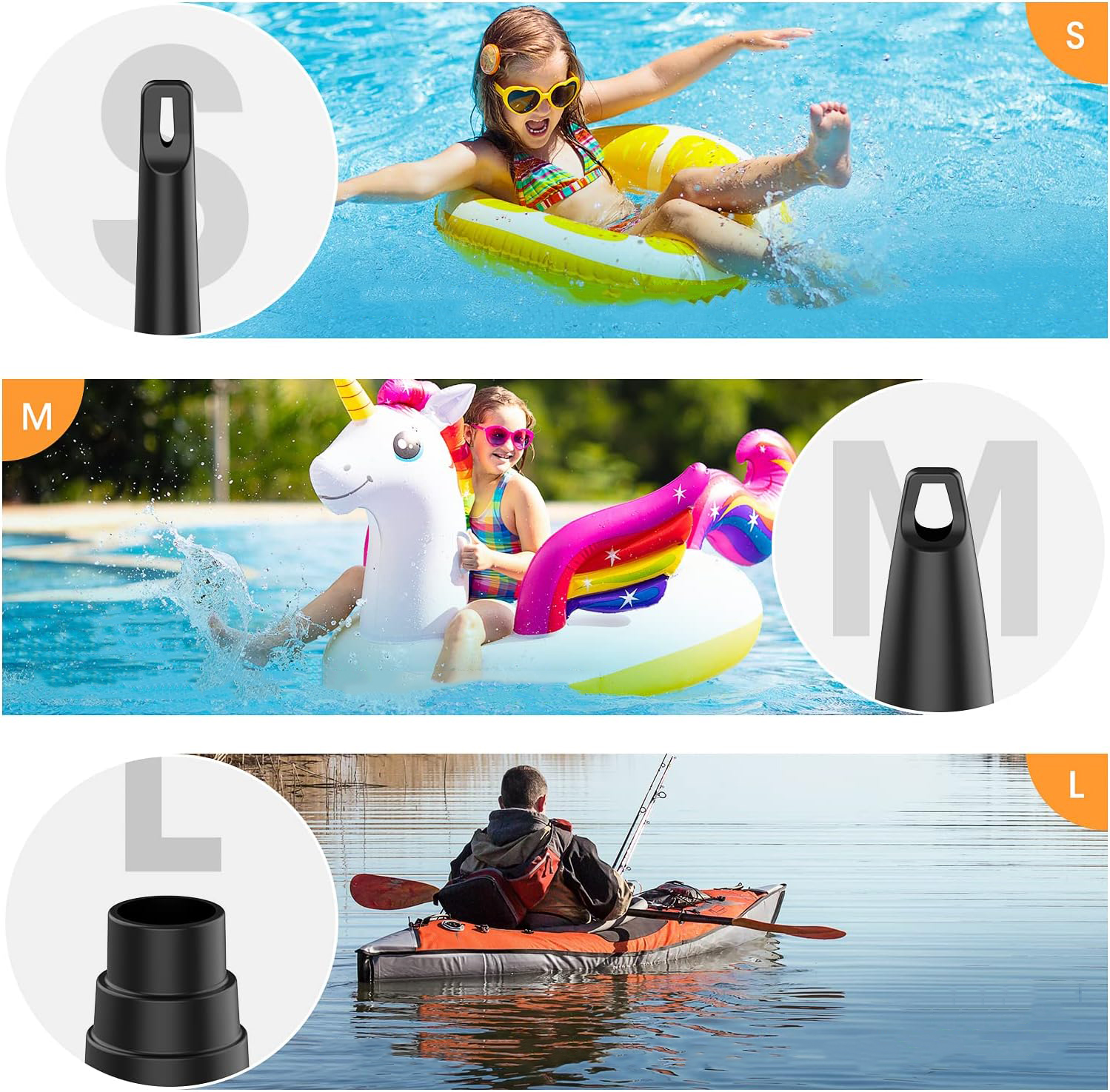 🫧🫧 【3 різні форсунки】 - Електричний повітряний насос оснащений трьома різними типами форсунок для задоволення різних потреб у перекачуванні. Він ідеально підходить для надувних, надувних матраців басейну, плавальних колеса, басейнів, басейнів, йог -кульок та інших надувних предметів. Він також може бути використаний для видалення зайвого повітря з вакуумних мішків.