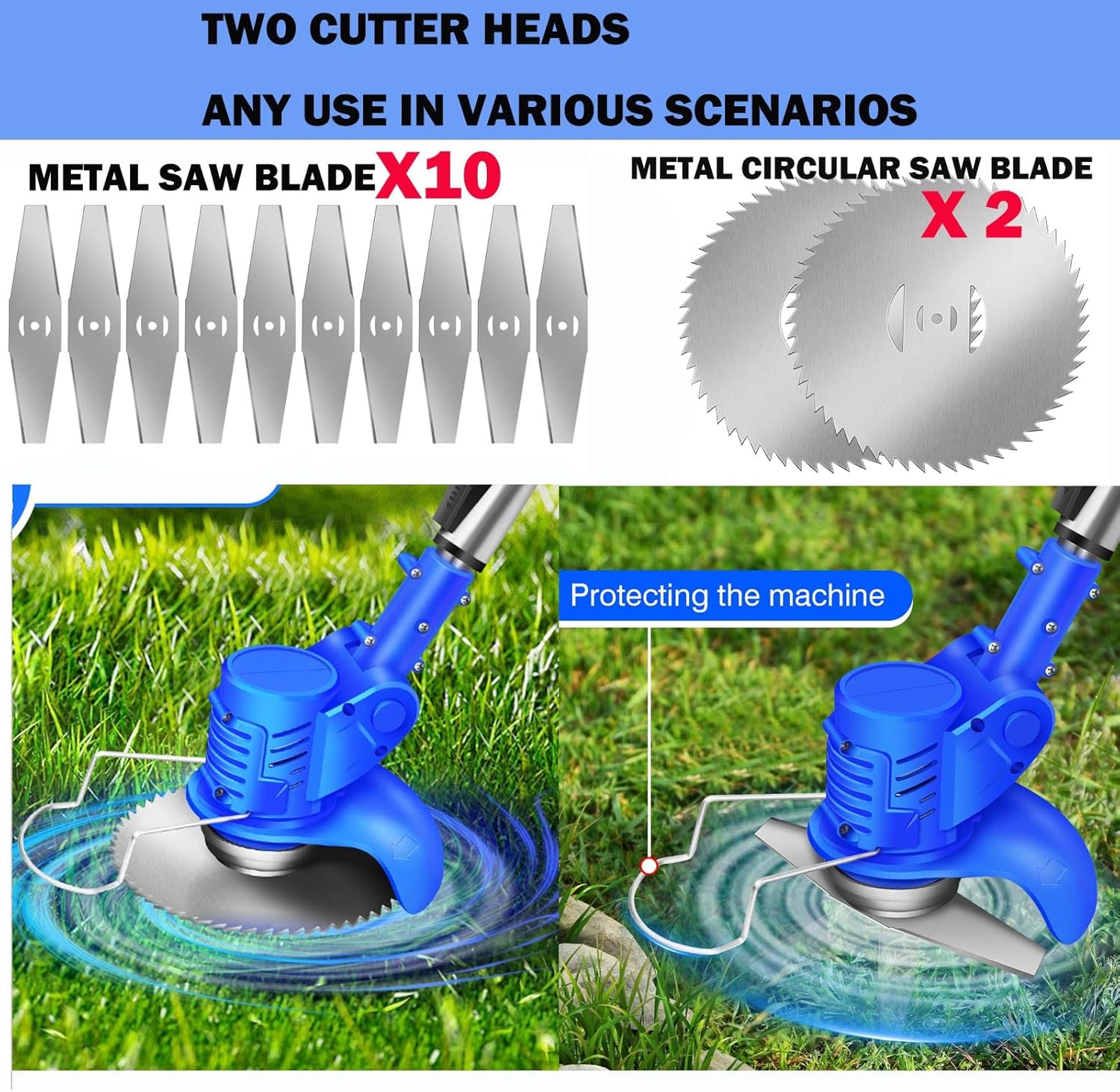 Металевий електричний край леза для трави - 21 В Садовий стриммер з 2 літієвим акумулятором та швидким зарядним пристроєм, 12 штук запасних леза для садових бур’янів, що різають газон
